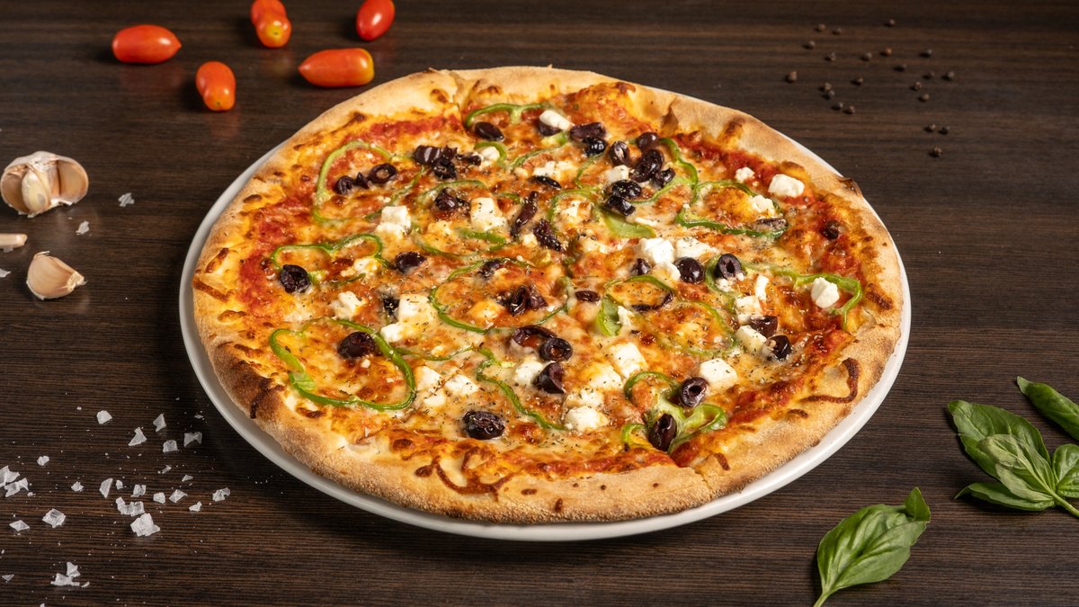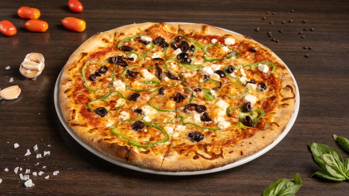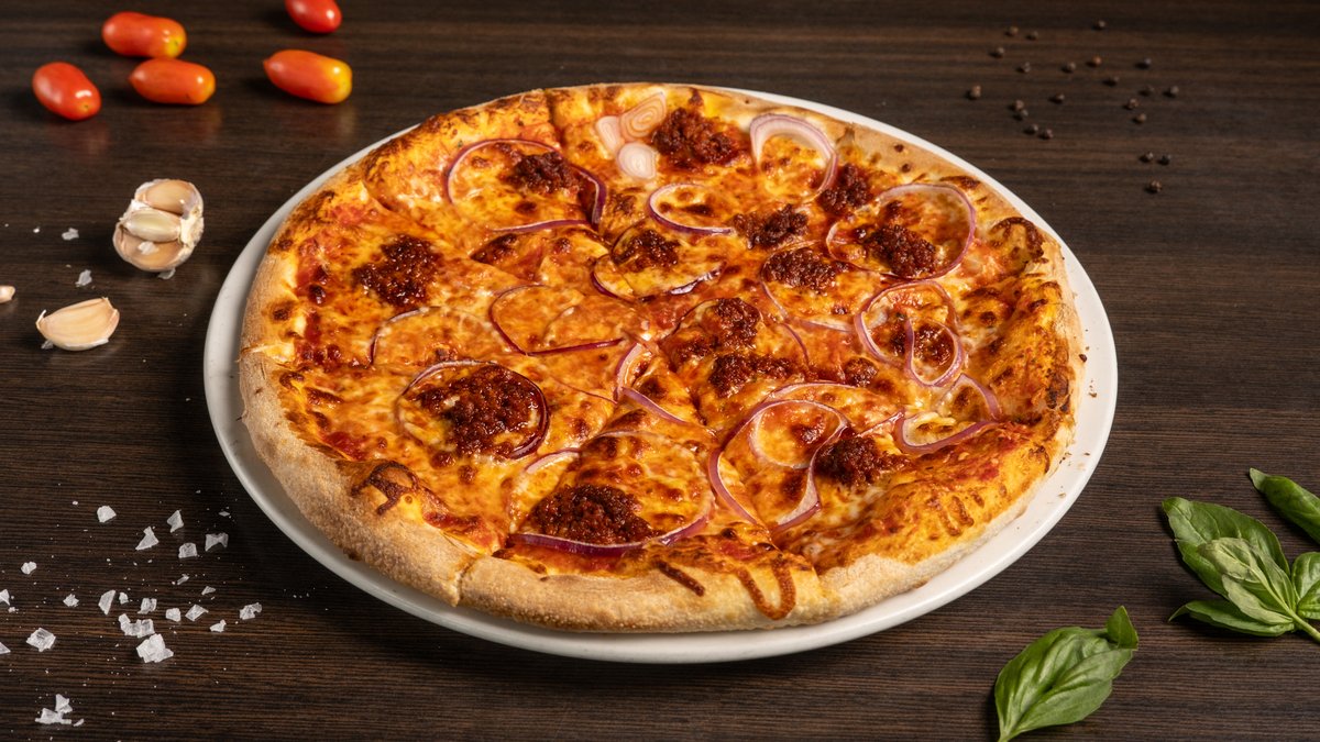 Tomato sauce, mozzarella, ham, bacon, mushrooms, green peppers and onion