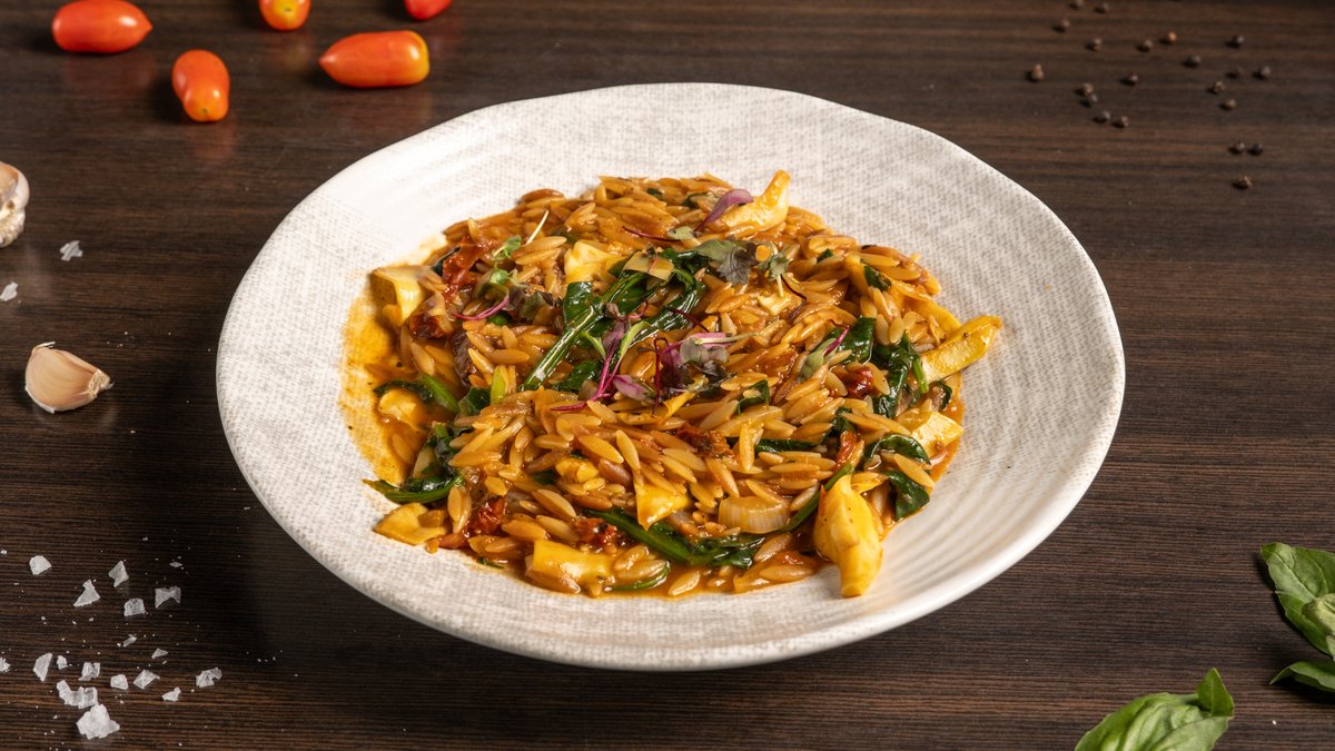 Orzo with spinach, artichoke hearts, sundried tomatoes, lemon zest & extra virgin olive oil