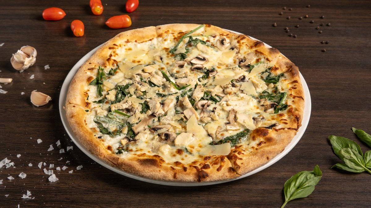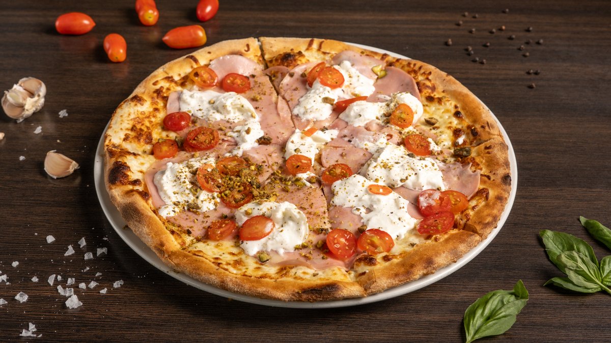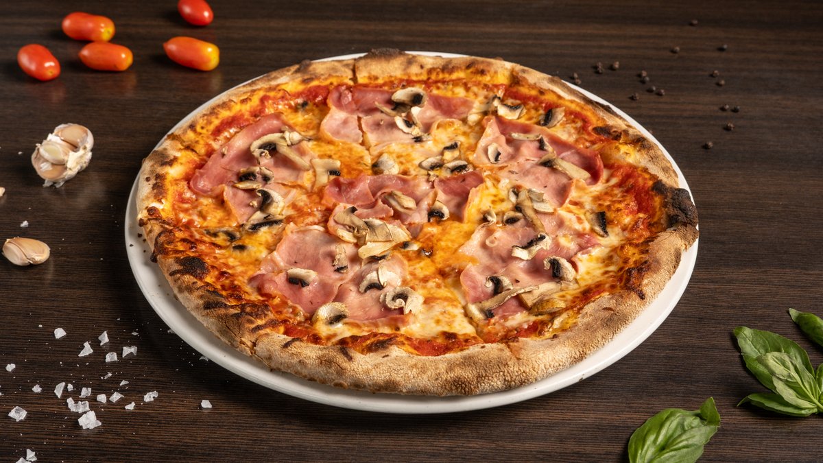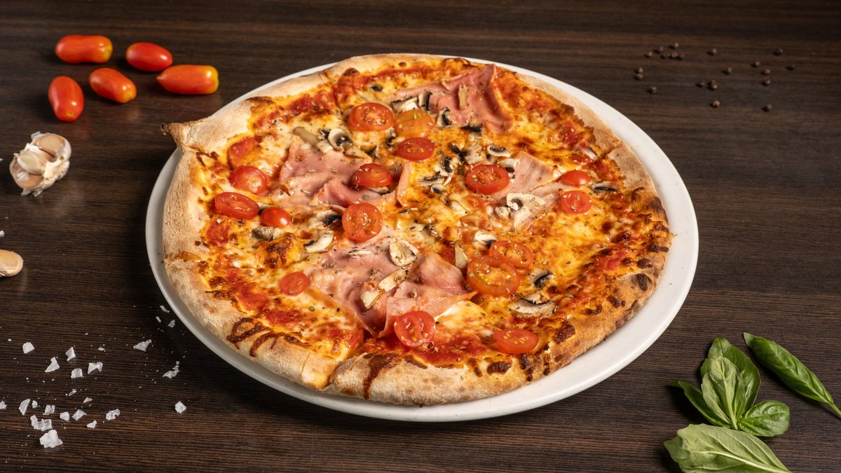Tomato sauce, mozzarella, ham, mushrooms, fresh tomatoes and oregano