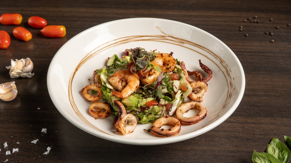 Satueed calamari & king prawns with chopped tomatoes, fennel, coriander & olive oil lemon vinaigrette, served on a bed of crispy lettuces.
