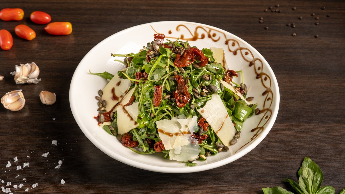 Rocket salad with sun-dried tomatoes, pumpkin seeds, parmesan flakes, and balsamic vinaigrette