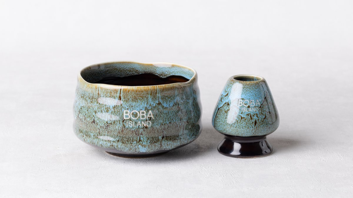 A beautiful ceramic matcha bowl and whisk holder set, featuring blue drip glaze with earthy undertones. Perfect for a stylish and authentic matcha making experience in style
