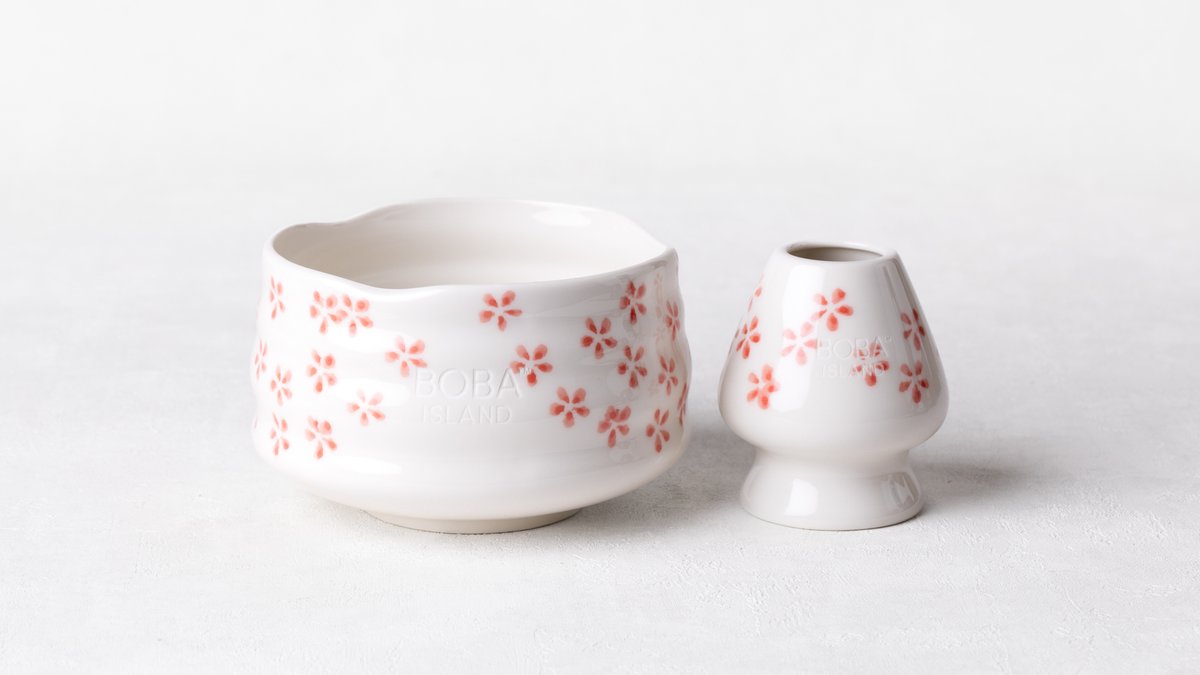 A pretty ceramic matcha bowl and whisk holder set, featuring soft pink floral patterns. Perfect for an authentic matcha making experience