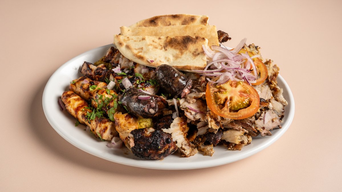 With gyros, souvlaki, chicken, sausage, bacon, pita, salad and dips