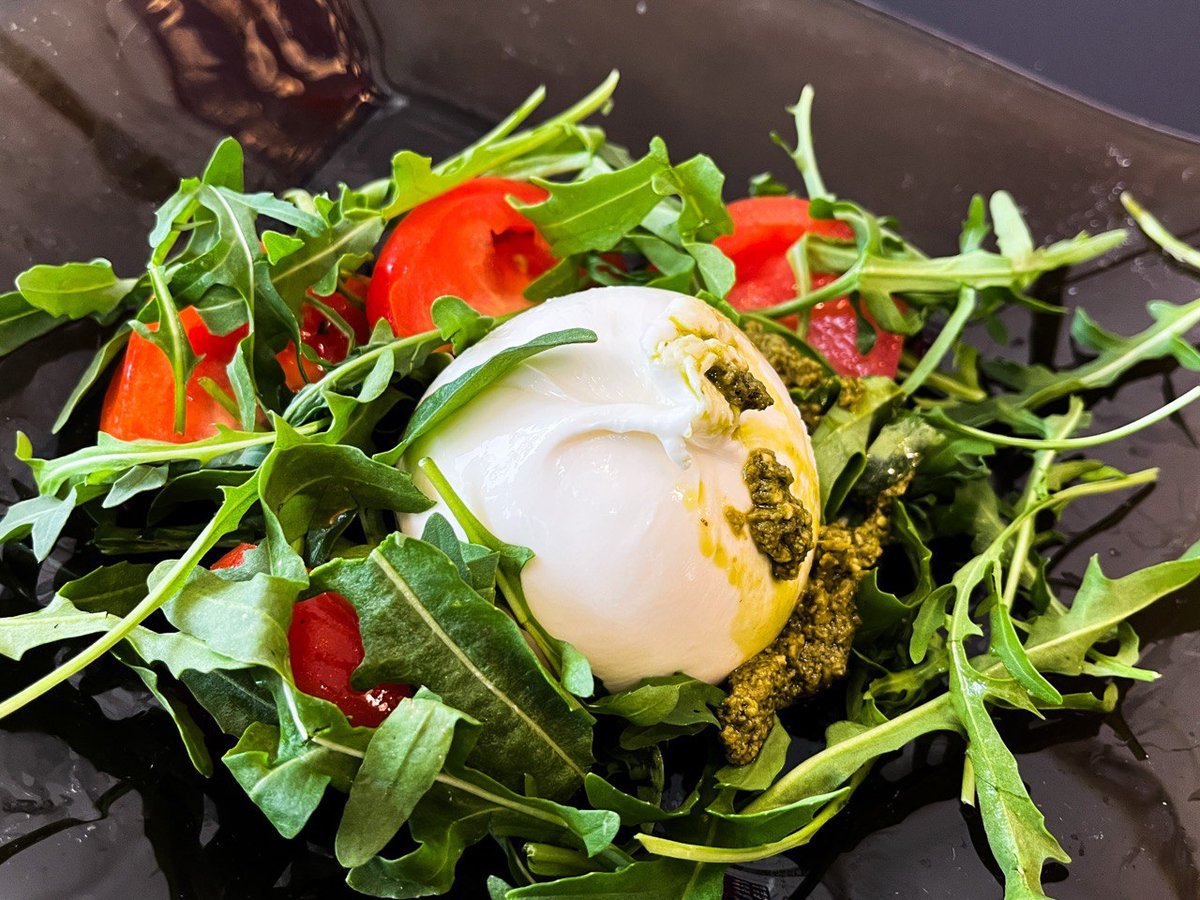 Juicy tomatoes, creamy burrata cheese, dollops of pesto & arugula. Simple, luscious, rustic perfection