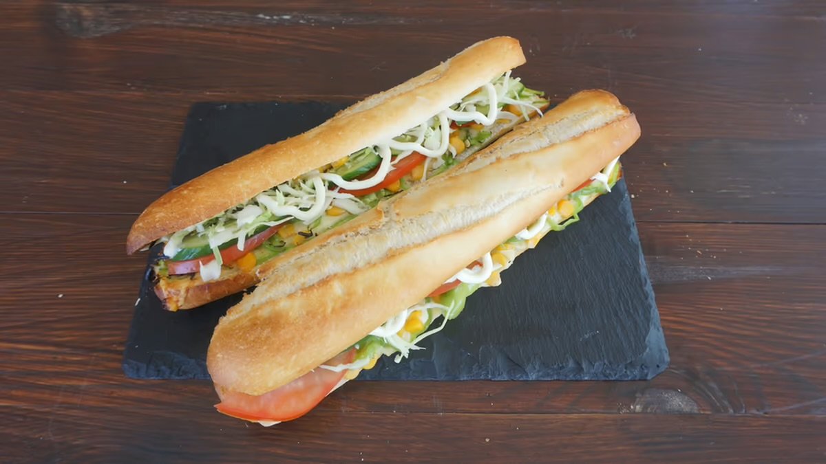 Vegan cheese, vegan mayo, lettuce, tomato, cucumber, sweet corn , cabbage & bell peppers