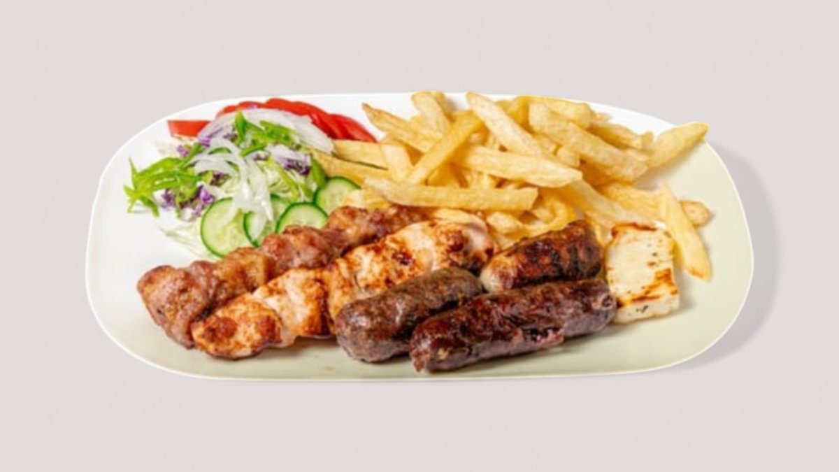 7 κεμπάπ χοιρινά, 1 σεφτάλια, 7 τεμάχια κεμπάπ κοτόπουλο, 1 λουκάνικο, 1 παστουρμάς, 1 χαλούμι, πατάτες τηγανιτές, σαλάτα, πίττα