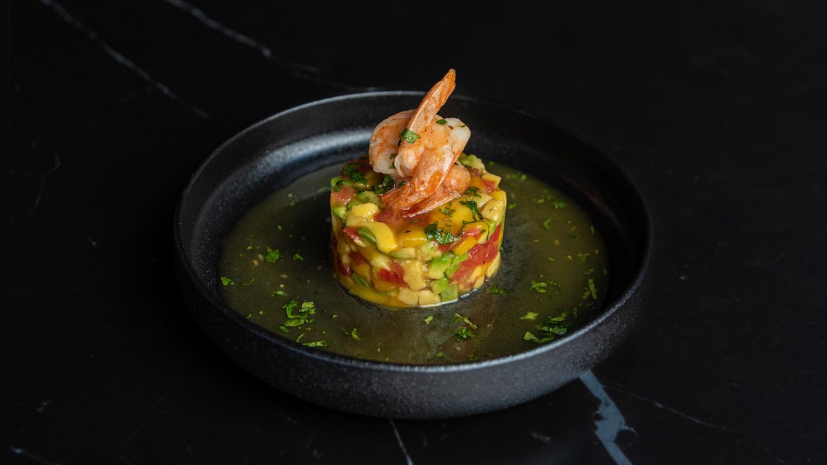 Mango, Avocado, Tomatoes Confit, Prawns with Mango, Fresh Coriander and Lime dressing.