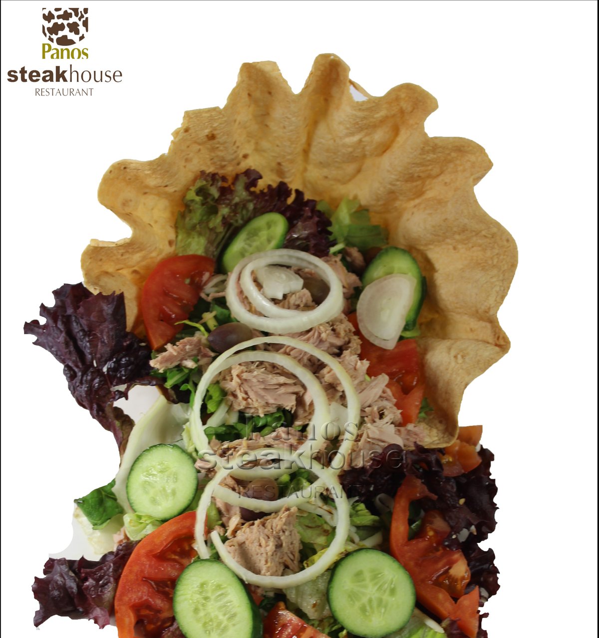 Taramas, vegetarian dolmades, village salad & French fries or jacket potato