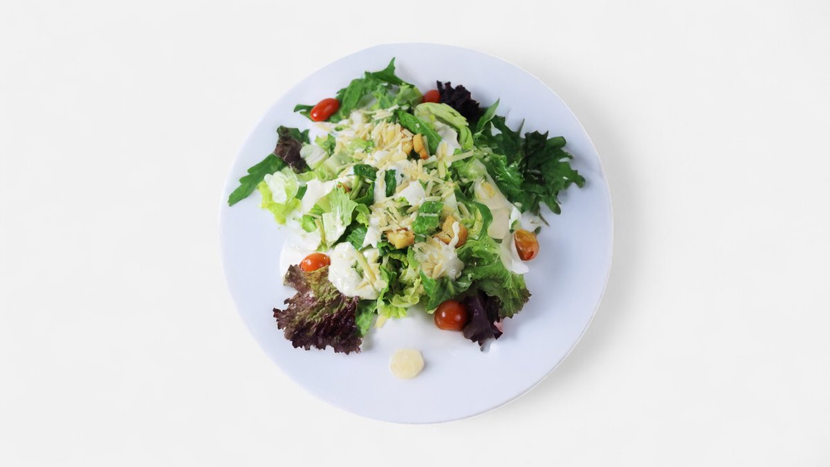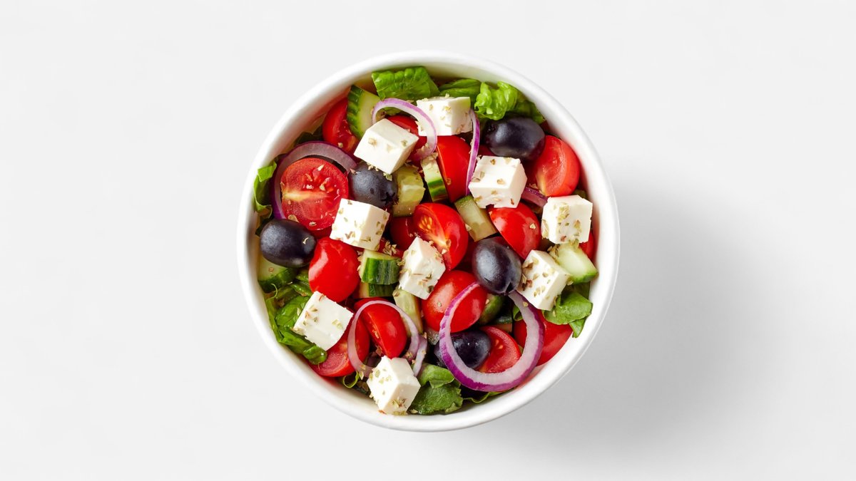 Traditional Greek salad with tomatoes, onions, cucumbers, green peppers, black olives, croutons pitta bread and fetta cheese, drizzled with virgin olive oil and vinegar dressing