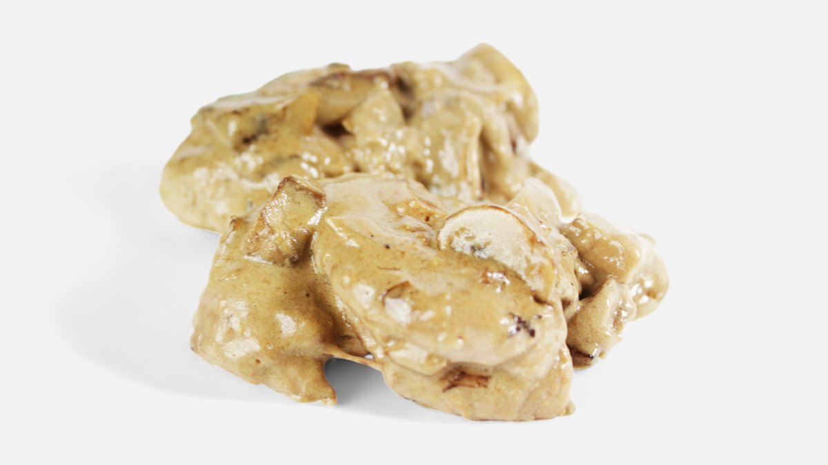 Pork fillet in sauce with mushrooms and onions, flambe with cognac and fresh cream