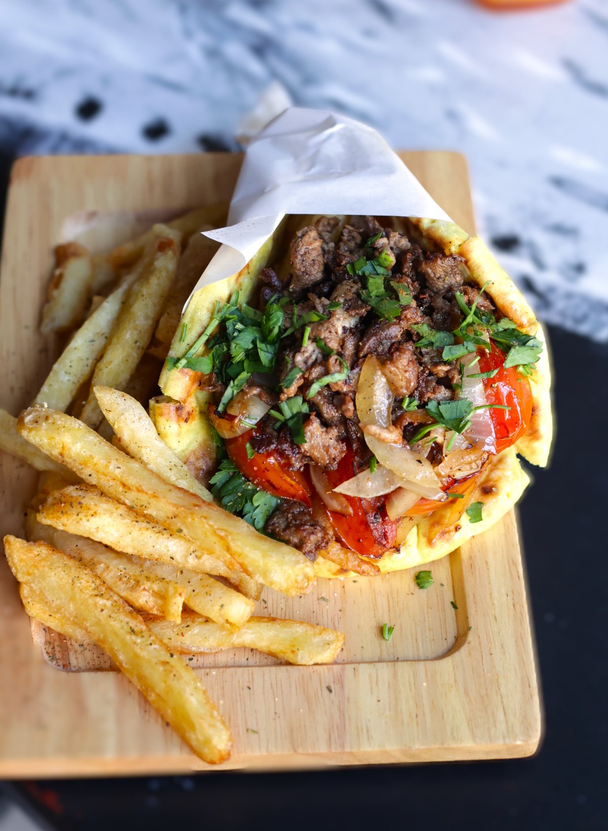Fries, tomato, parsley ,onion, pickles, tahini