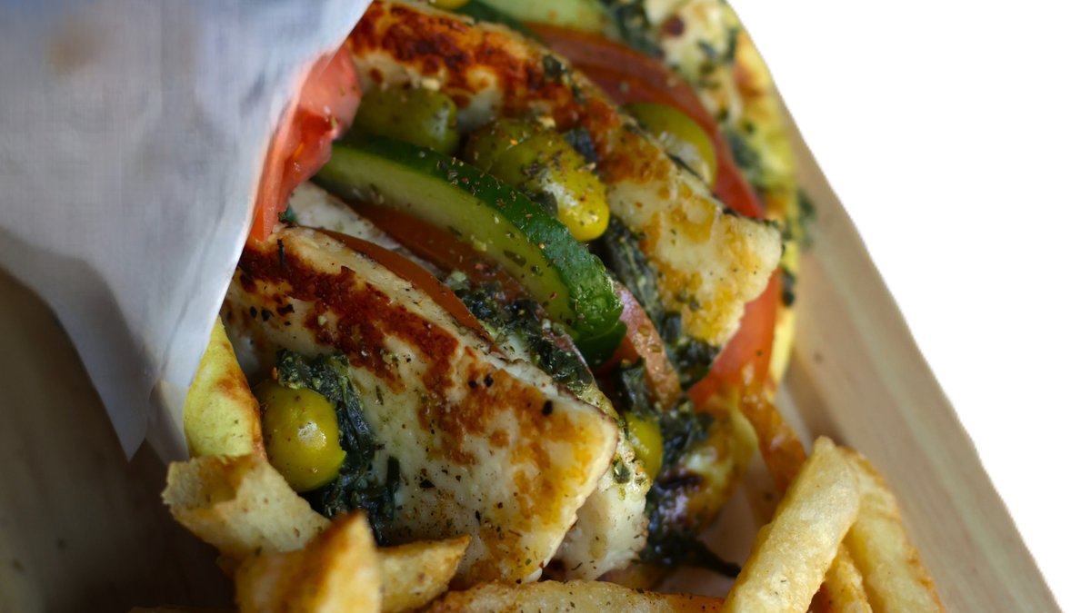 Beef Gyro, Mixed Cheese, Tomato, Onion, Iceberg, Tahini Sauce. Served with French Fries.