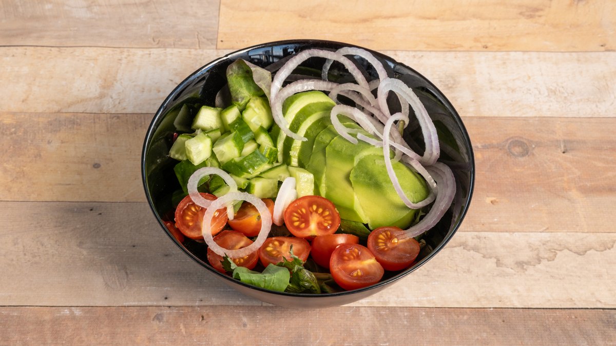 With mix salad, sliced onion, tomato, cucumber, halloumi