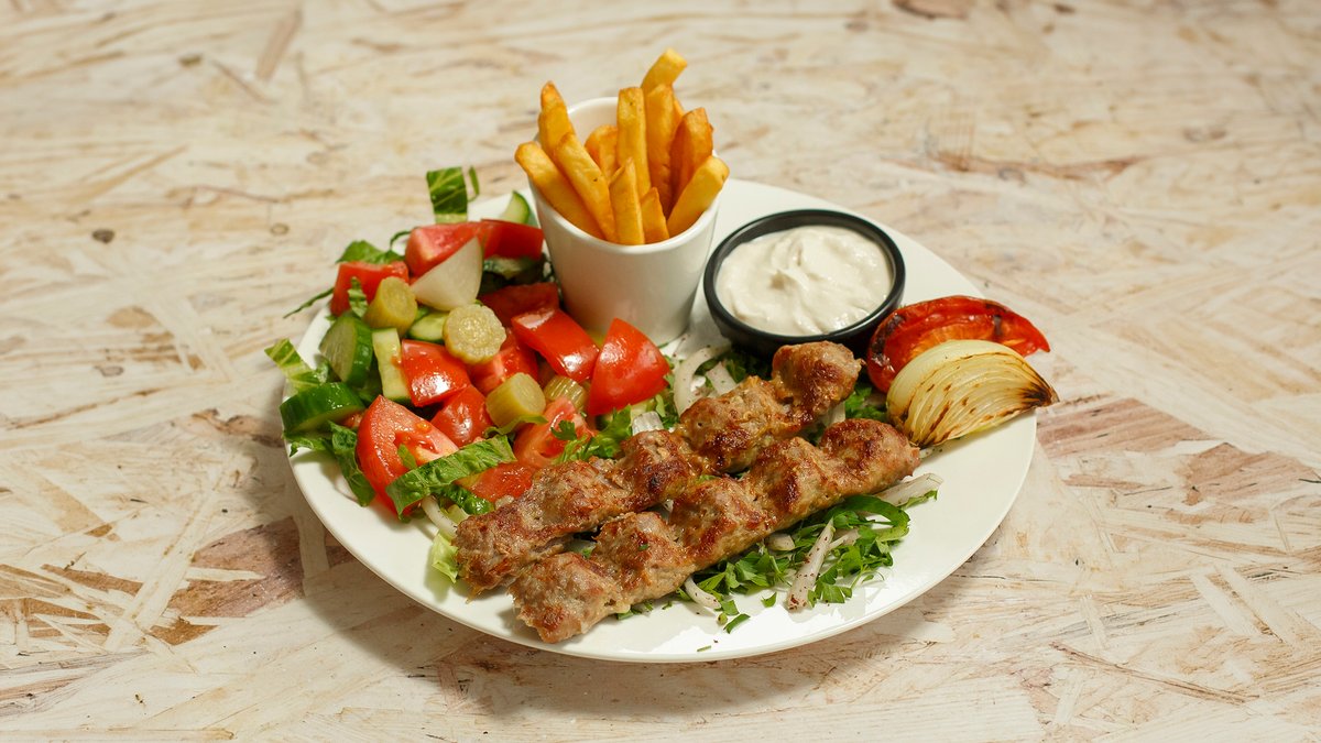 Served with garlic sauce, tomato, pickles, French fries, Arabic pita and mixed salad