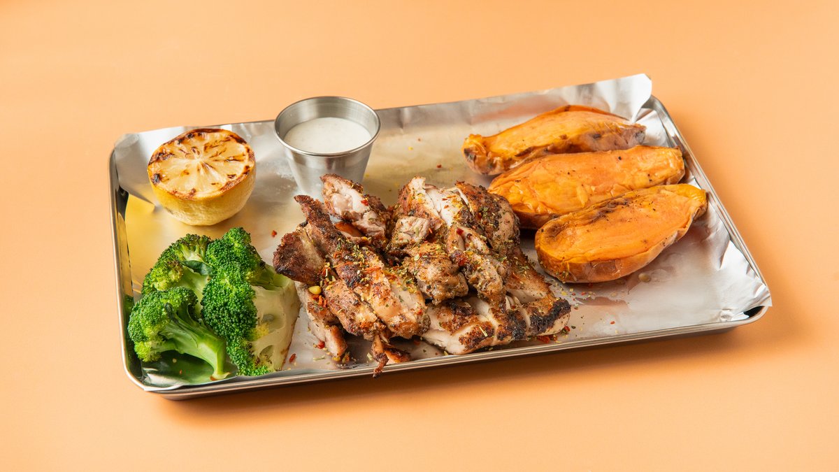 Charcoal chicken thigh, roasted sweet potatoes, grilled broccoli, yoghurt sauce