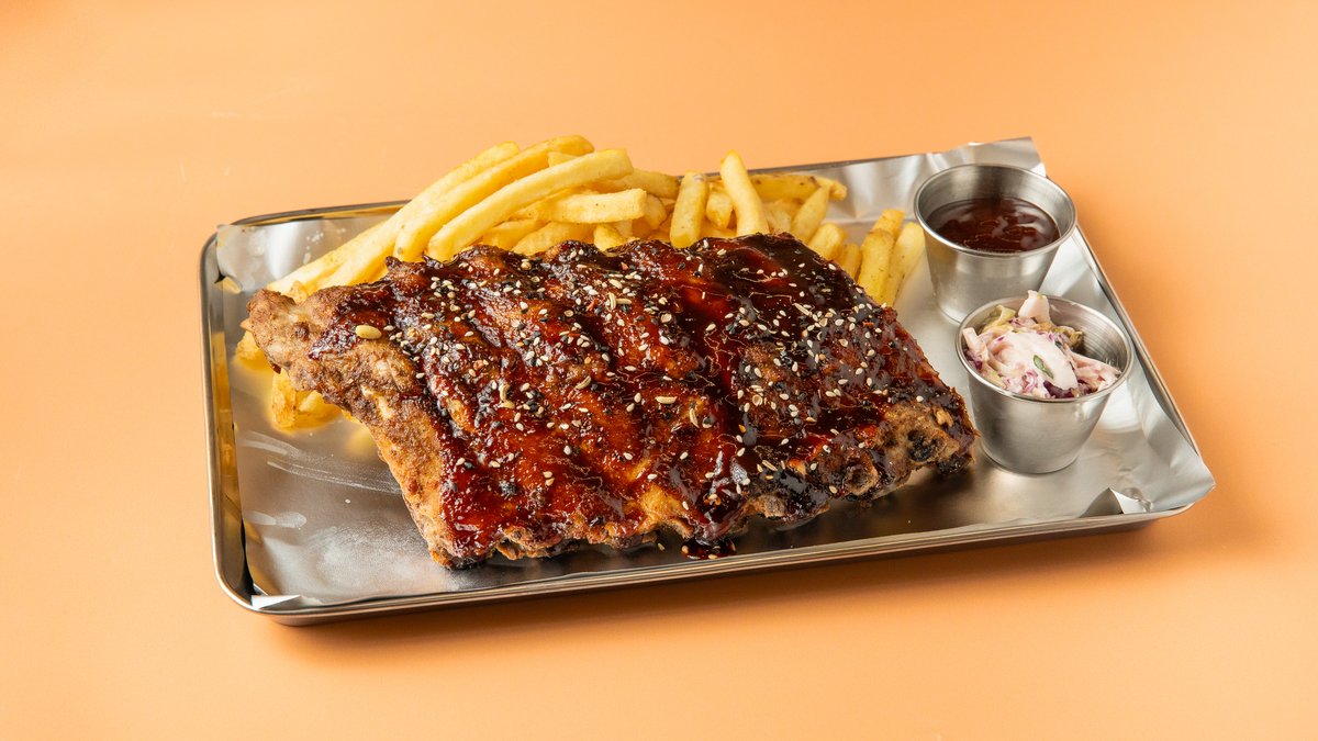 Grilled pork spare ribs, spicy bbq sauce, coleslaw, french fries