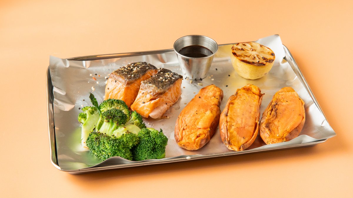 Roasted salmon, roasted sweet potatoes, broccoli, soy & honey glaze, lime, sesame, coriander