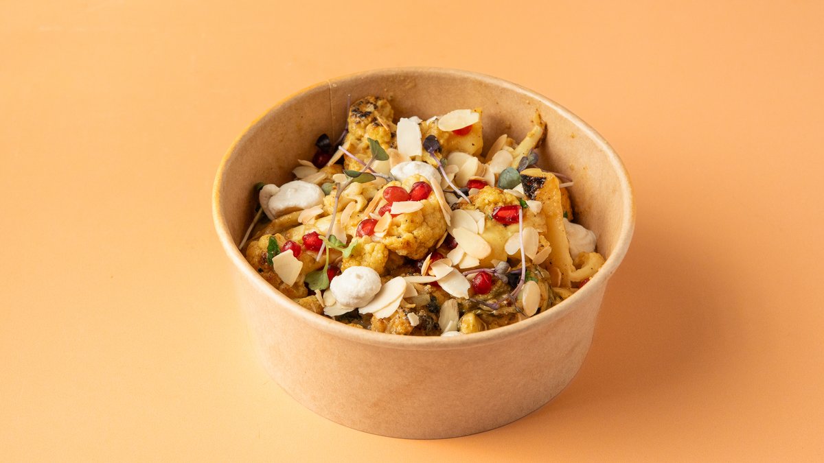 Fried cauliflower, peanut butter, tahini, pomegranate, almond flakes