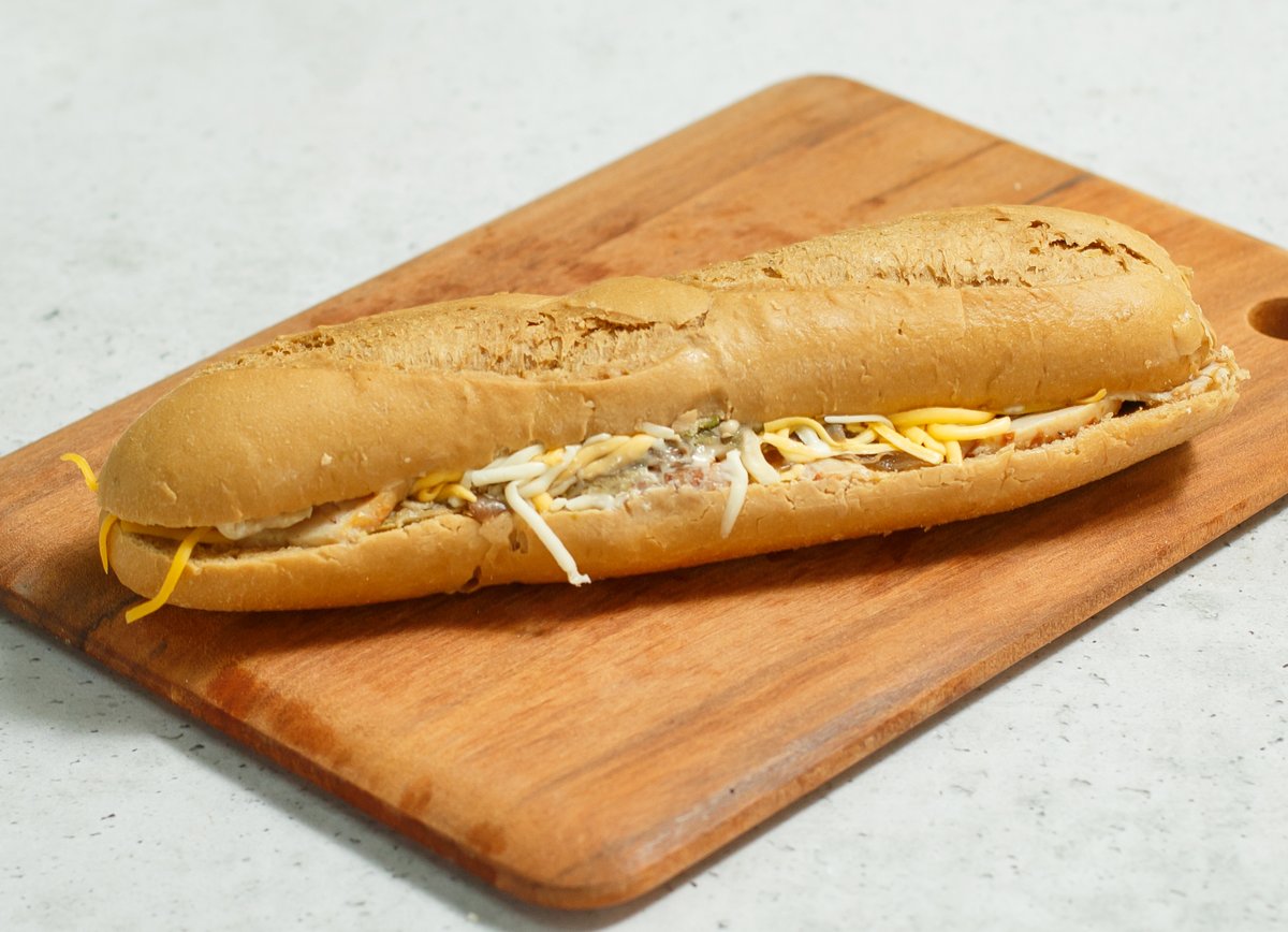 Brown baguette, chicken fillet, mozzarella, cheddar, caramelised onions, avocado sauce, yoghurt and mayonnaise