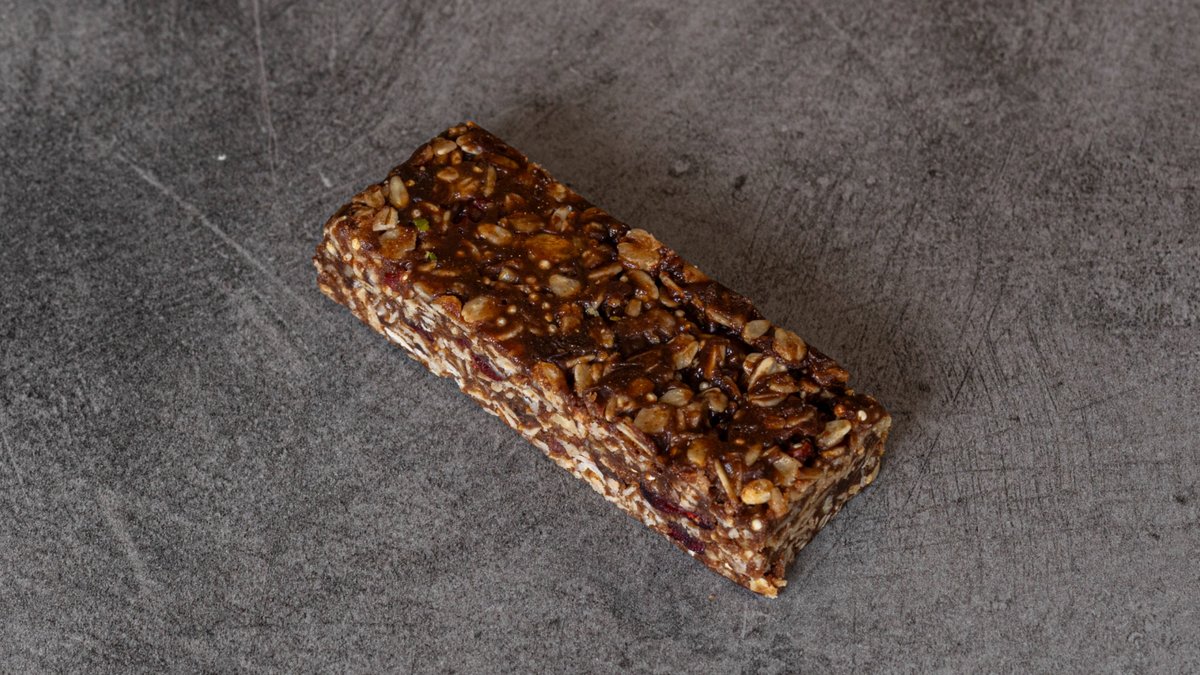Biscuit, cocoa, dark chocolate, coconut cream maple syrup, oats, pistachio, cranberries, quinoa