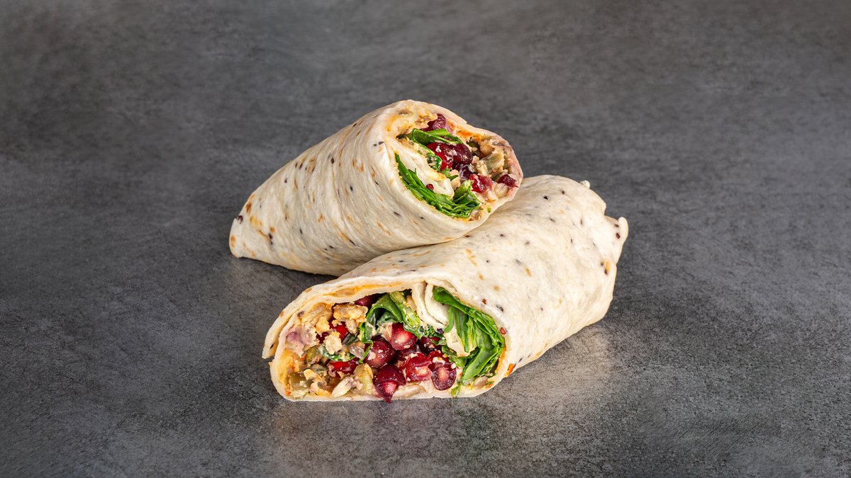 Tortilla, roasted bell peppers, peppers hummus, roasted seeds, pomegranate, rocket salad