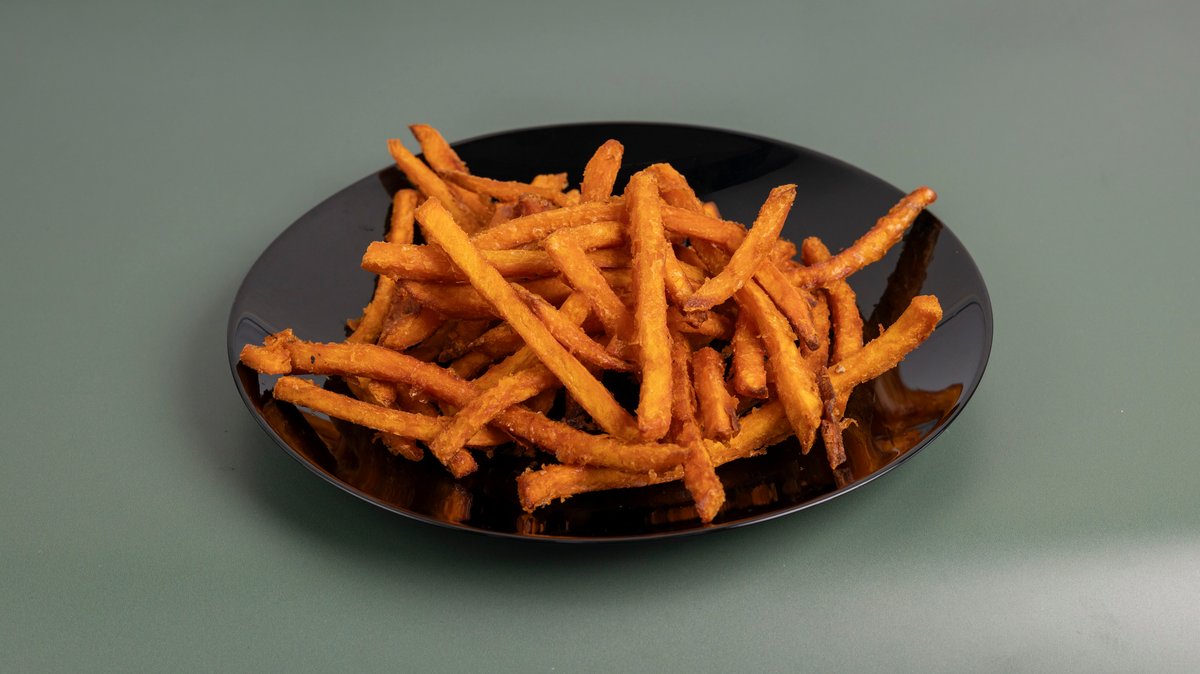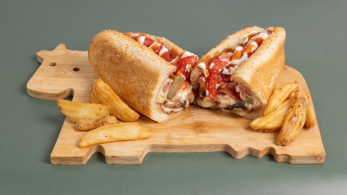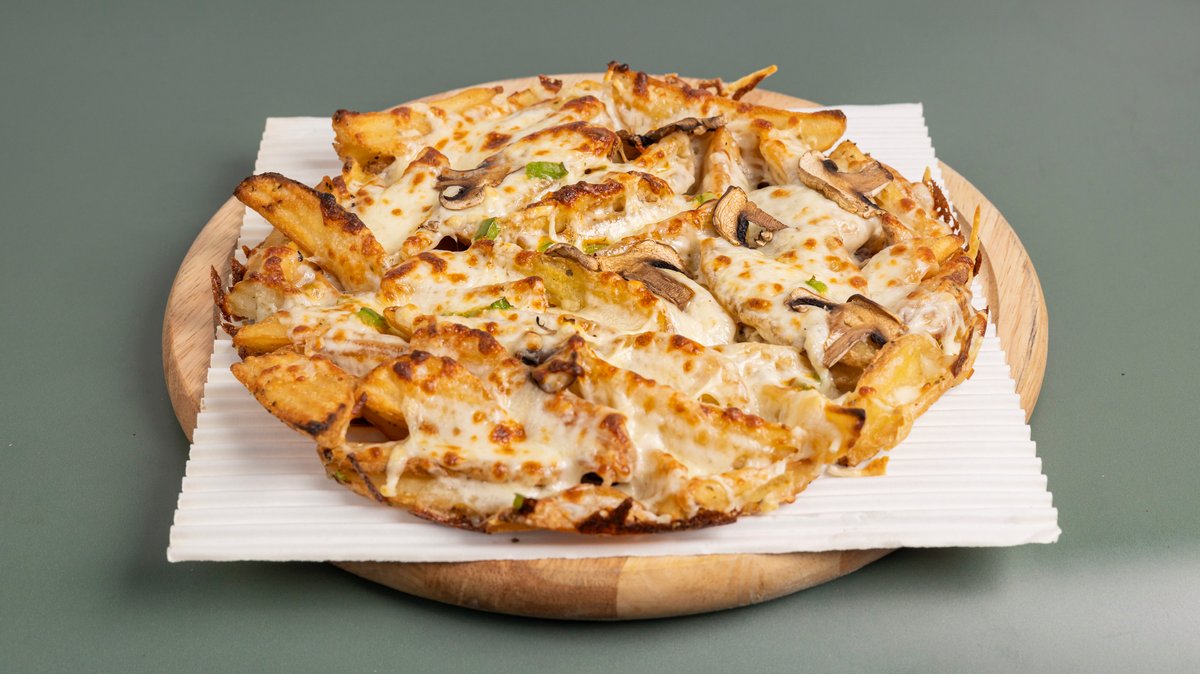 Fries with melted cheese bacon, mushrooms, jalapeno and tomato sauce