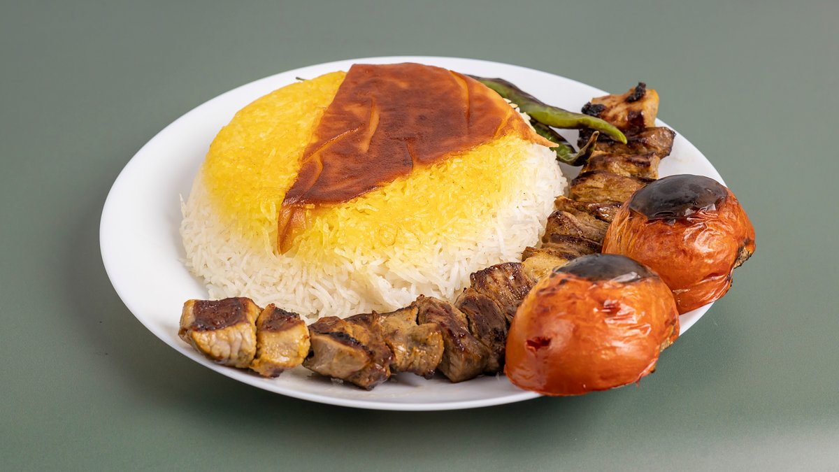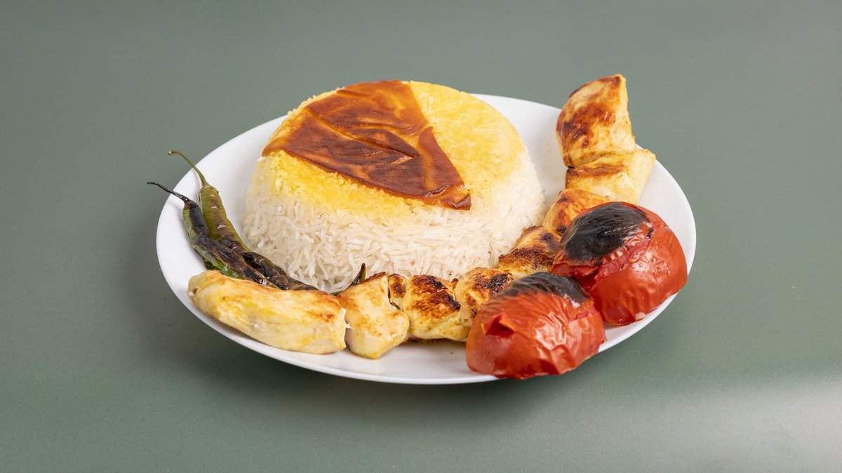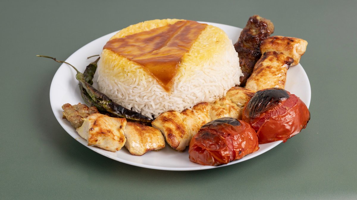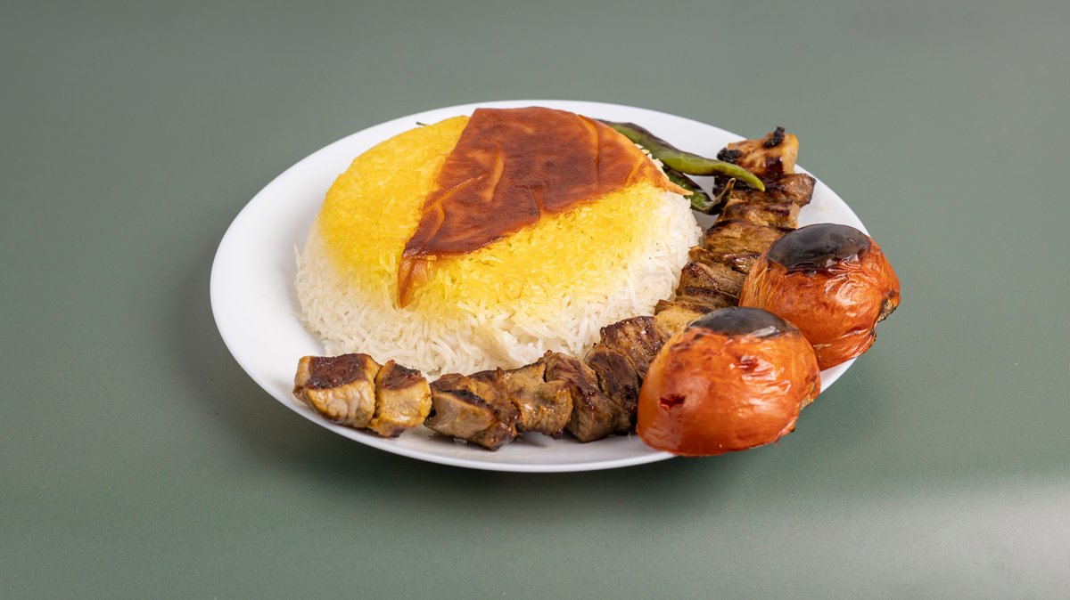 One chicken skewer, one koobideh skewer, grilled tomato and rice or chips