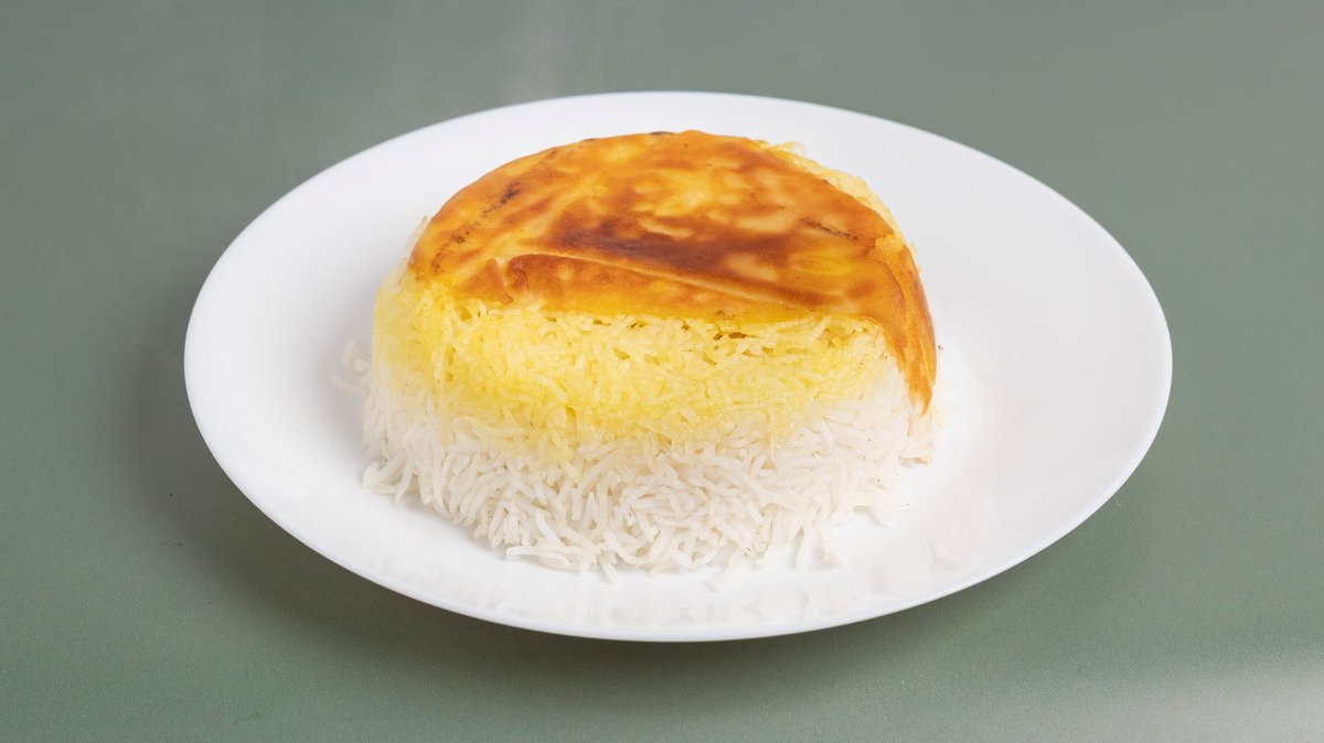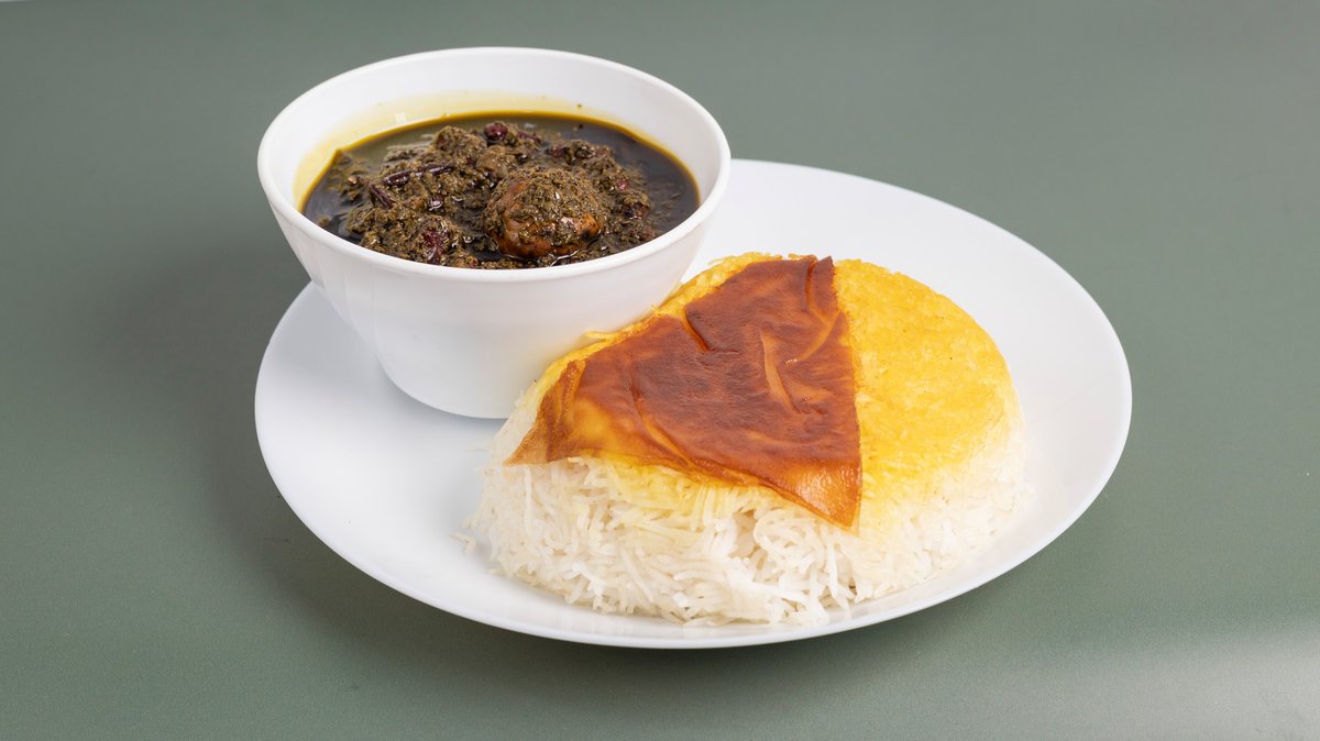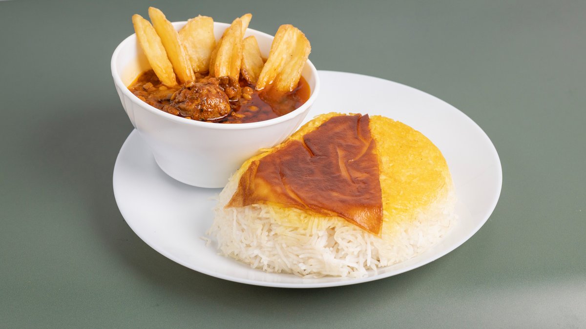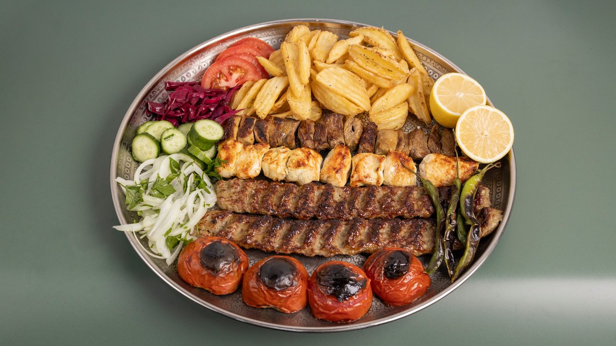 One chicken skewer, one koobideh skewer, grilled tomato and rice or chips