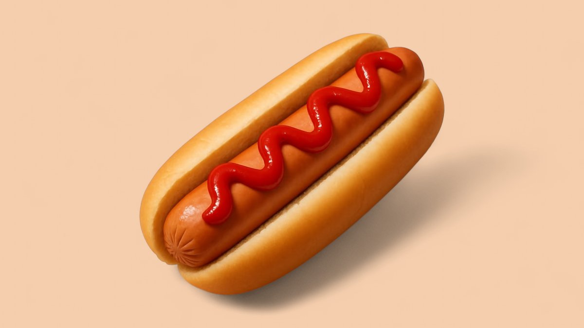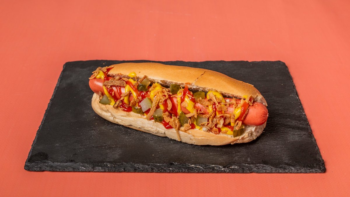 Bun, classic hot dog sausage, mild mustard, ketchup, pickles, fried crispy onions