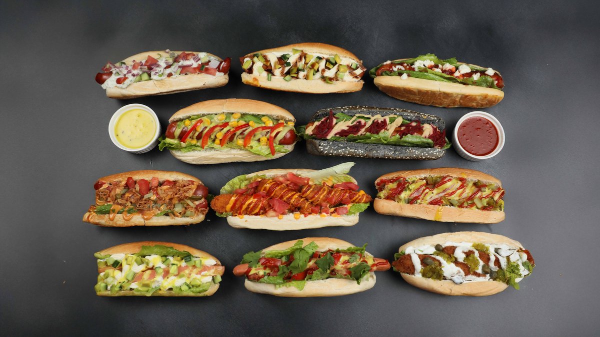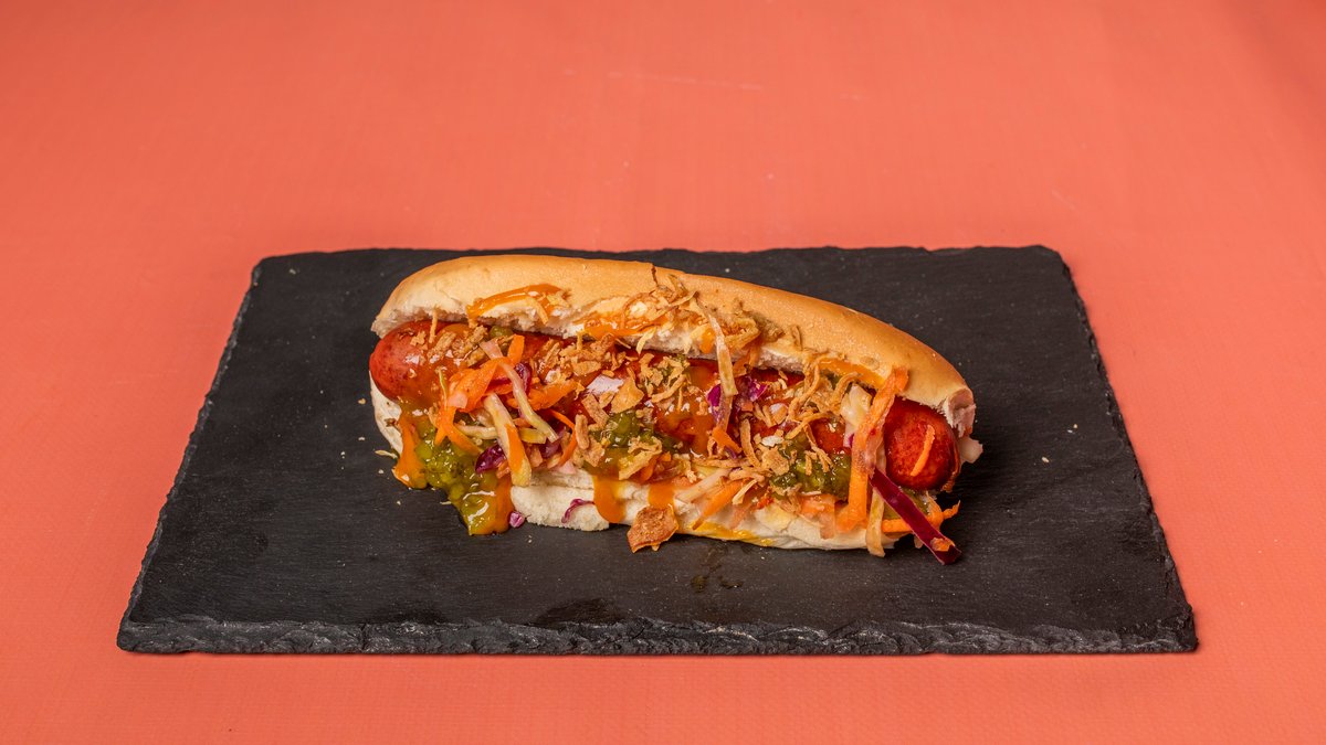 Bun, classic hot dog sausage, secret chef sauce, korean spicy carrot salad