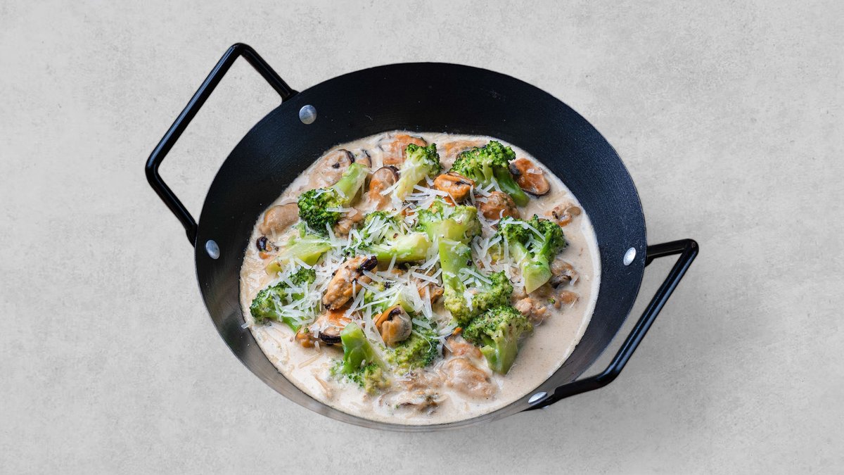 Tender mussels and fresh broccoli cooked in a rich cream sauce.