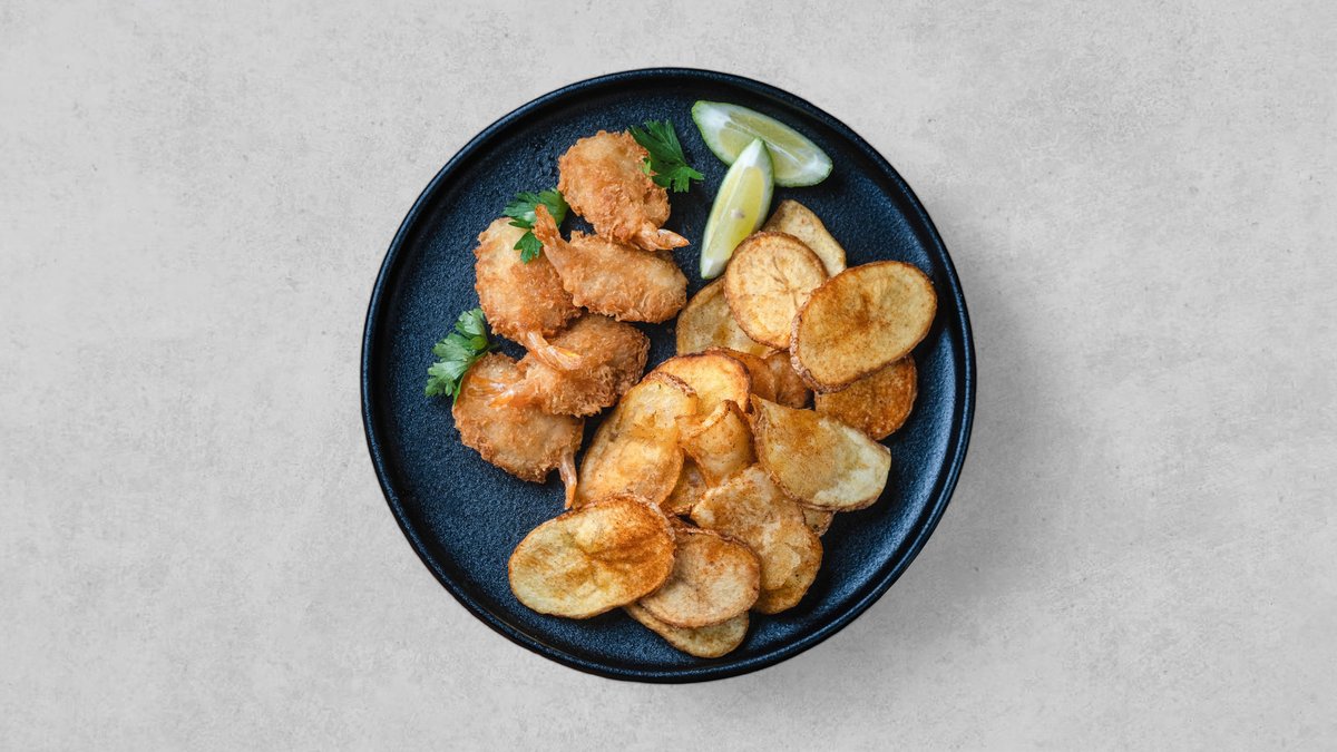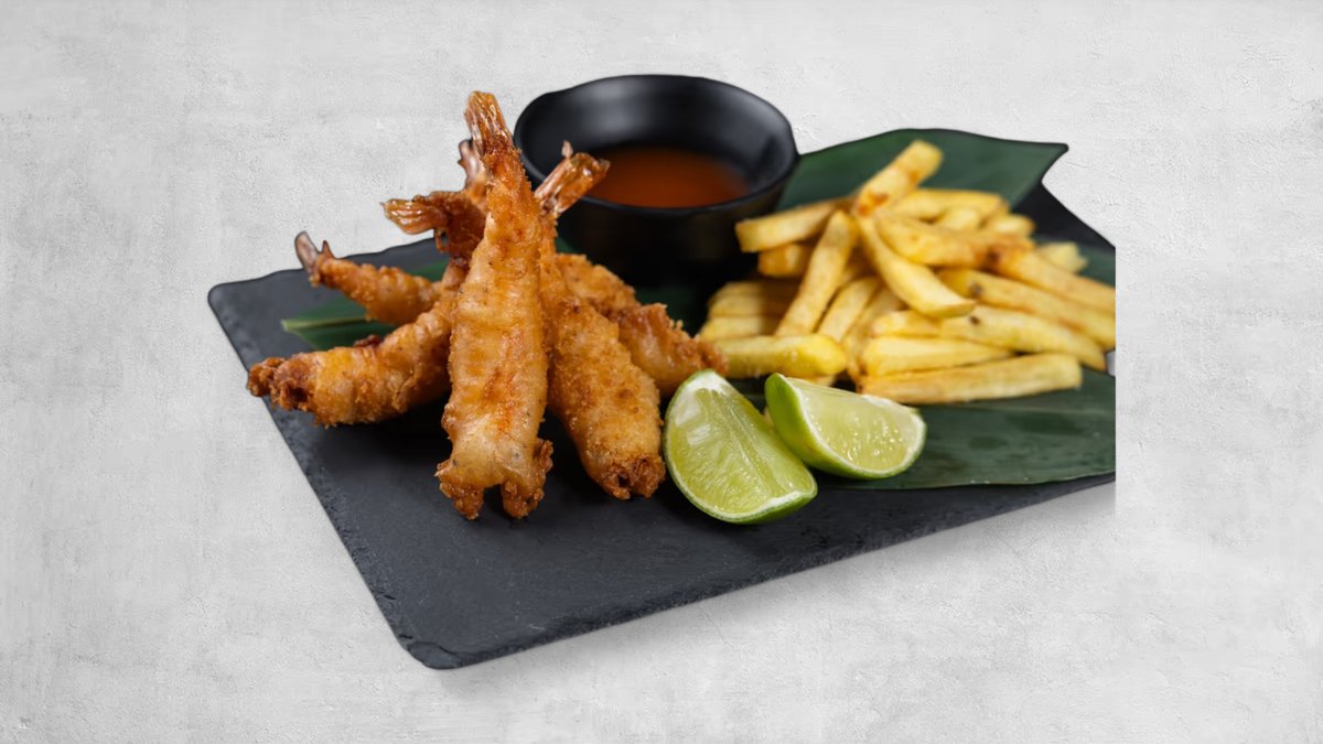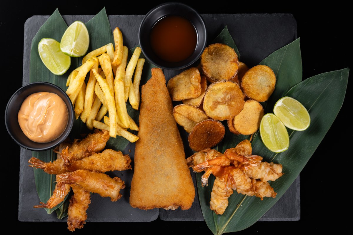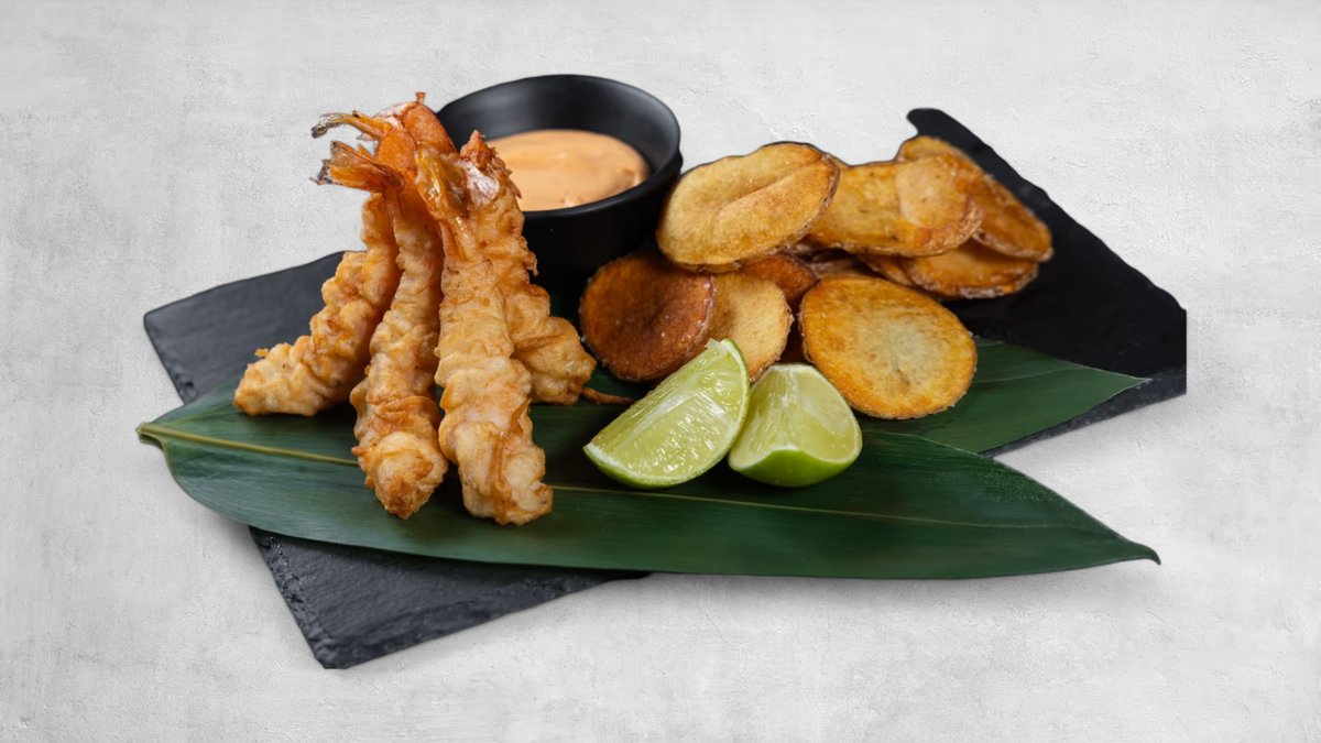 beer battered shrimp with mango sauce, tempura shrimp, homemade chips, fish and chips