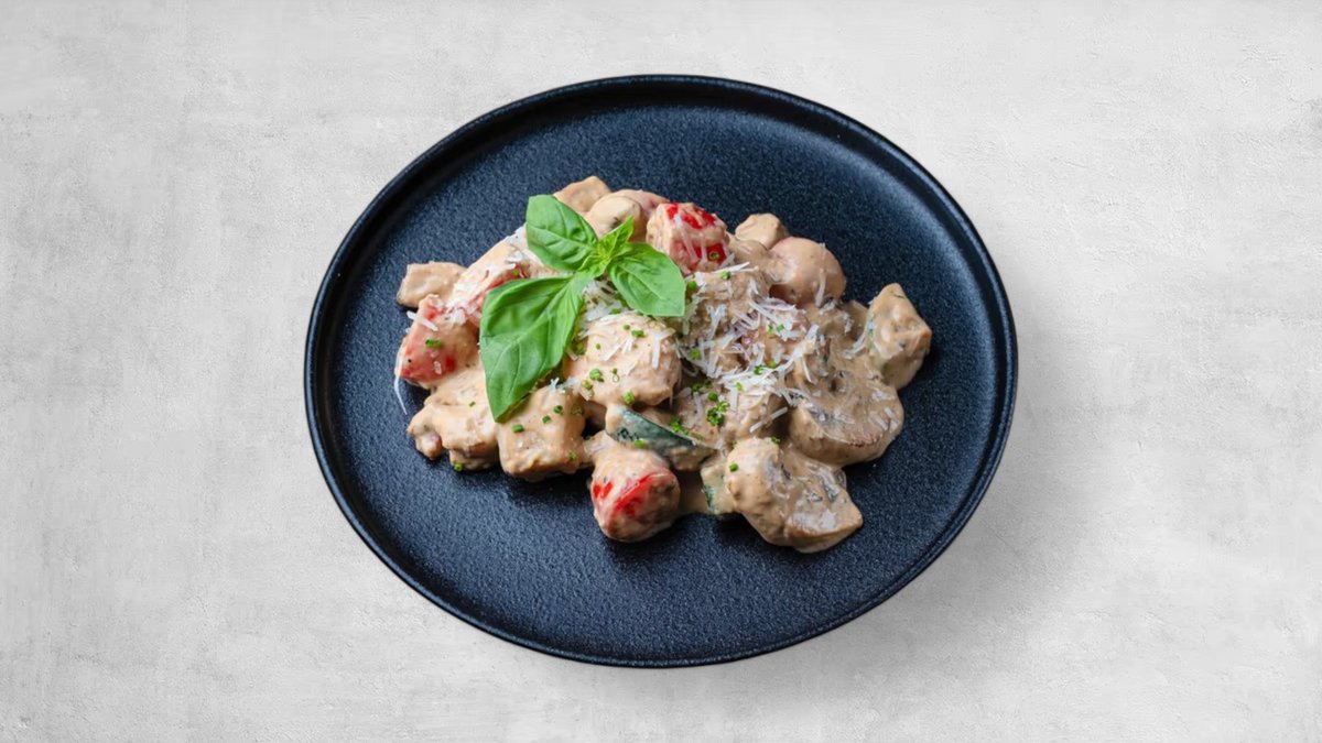 Succulent shrimp, tender zucchini, earthy mushrooms, and juicy cherry tomatoes in a rich cream sauce.