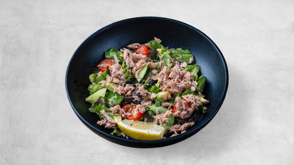tuna, lettuce, cucumber, tomato, red onion, qenoa, spicy mayo, olive oil, lemon juice