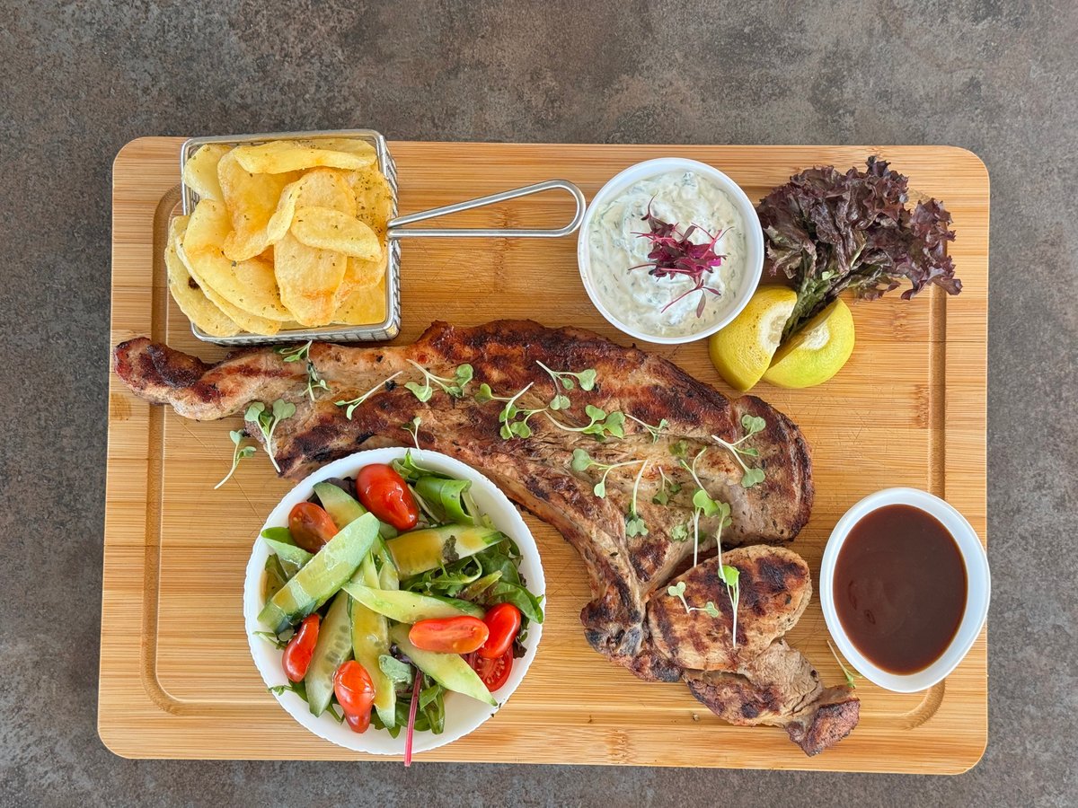 Jumbo pork chop. Served with French fries or jacket potato, salad and barbecue sauce.