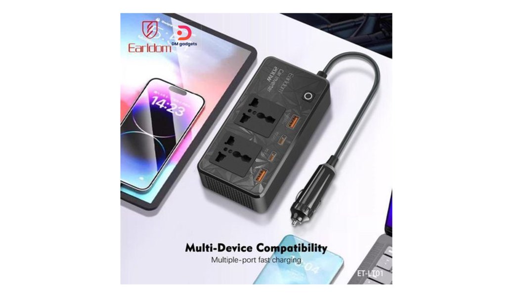 #340BA#Earldom®ET-LT01 Car Power Inverter, 2 USB-A + 2 USB-C + 2 AC Outlet, 200 Watt, Black