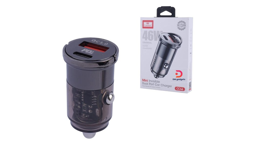 #338A1#Earldom®ES-CC46 46W Mini Invisible Dual Port Car Charger with USB-C PD and USB-A QC3.0 – Black