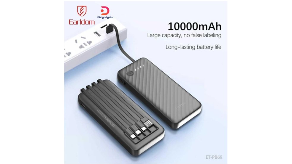 #588B1#Earldom®PB69 4-in-1 Universal Power Bank 10000mAh with Built-in 4 Cables - Black
