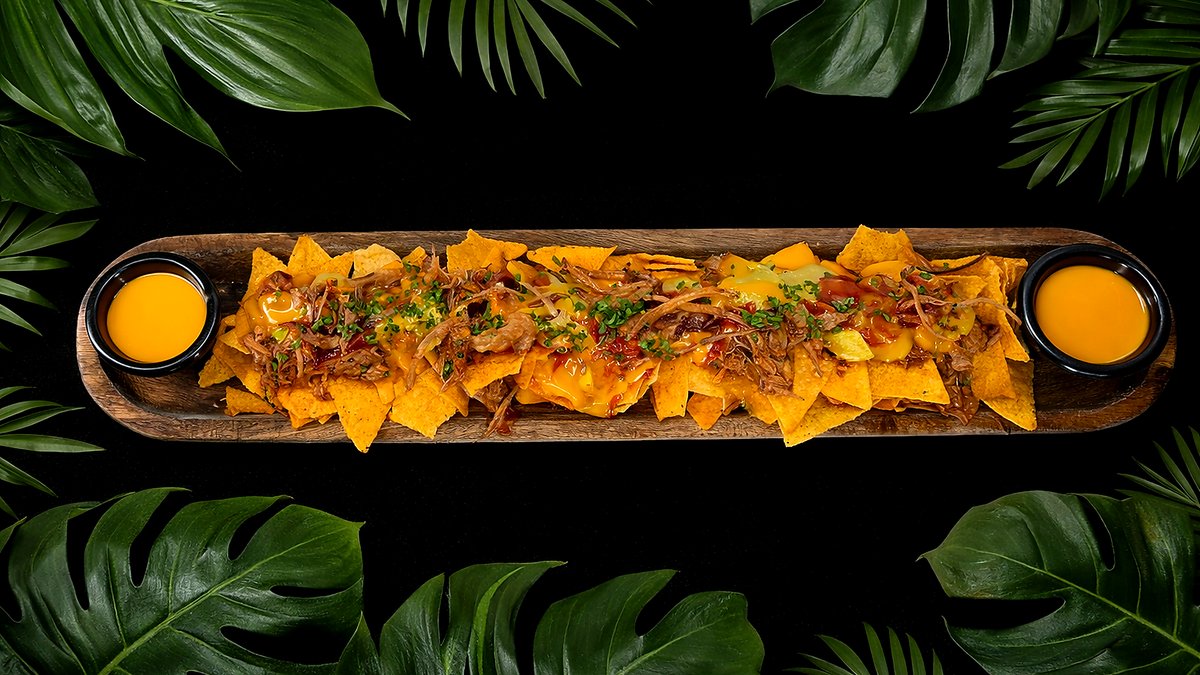 • Nachos • Guacamole • Cheddar cheese • Salsa Tomato • Pull Pork • Crispy Onion • Chives