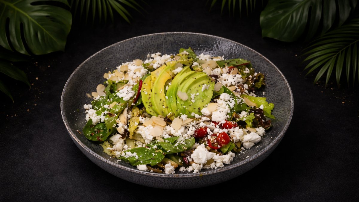 • Mixed leaves • Quinoa • Green apple cubes • Pomegranate • Cherry tomatoes • Cucumber • Chives • Balsamic sauce • Avocado slices • Goat cheese • Black sesame seeds • Almond flakes