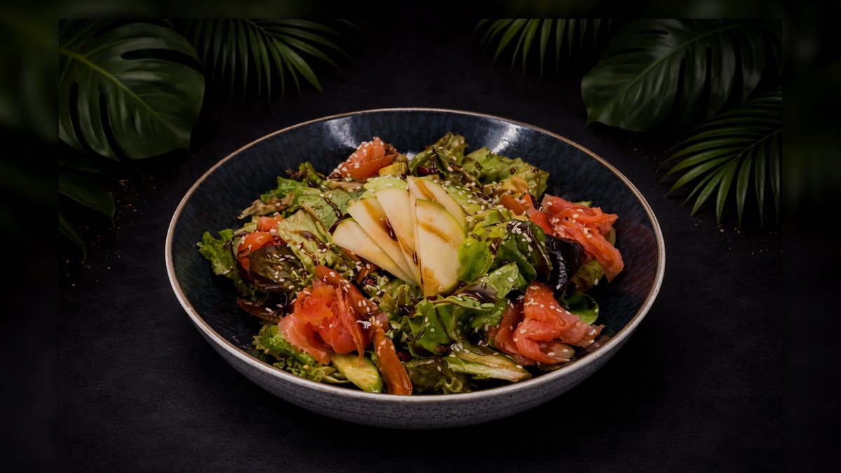 • Mixed leaves • Cherry tomatoes • Avocado • Cucumber • Carrots • Balsamic sauce • Pomegranate • Smoked salmon • White sesame seeds • Green apple • Balsamic glaze