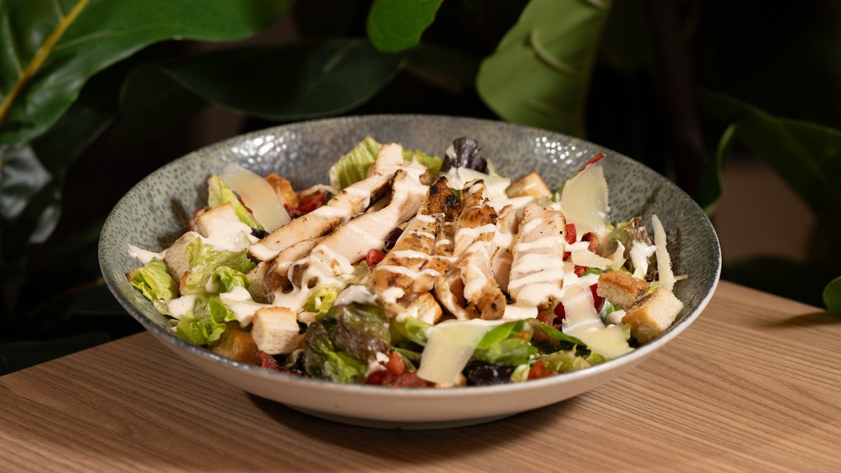 • Mixed leaves • Cherry tomatoes • Bacon (chopped) • Parmesan cheese • Caesar sauce • Croutons • Parmesan flakes • Chicken fillet