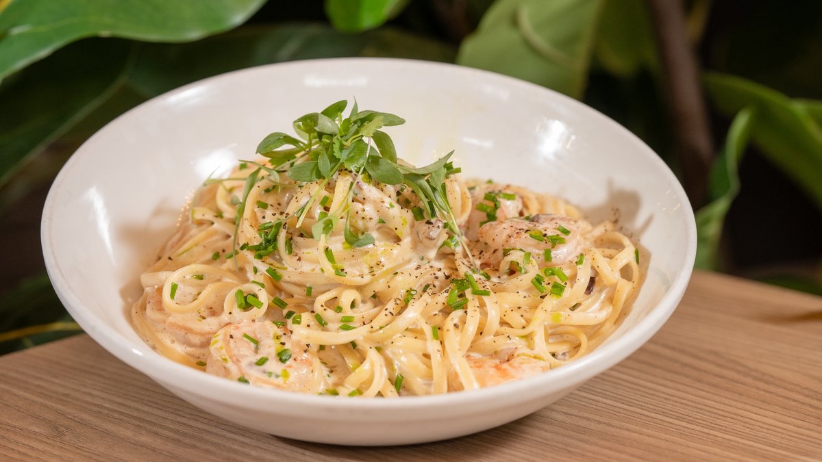 • Pennes or linguine pasta • Shrimp (8 pcs) • Fresh cream • Parmesan cheese • Chives • Green oil