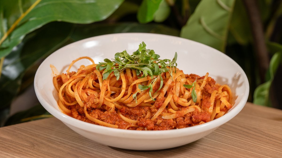• Pennes or linguine pasta • Tomato sauce • Bolognaise • Parmesan cheese • Micro leaves • Green oil • Chives