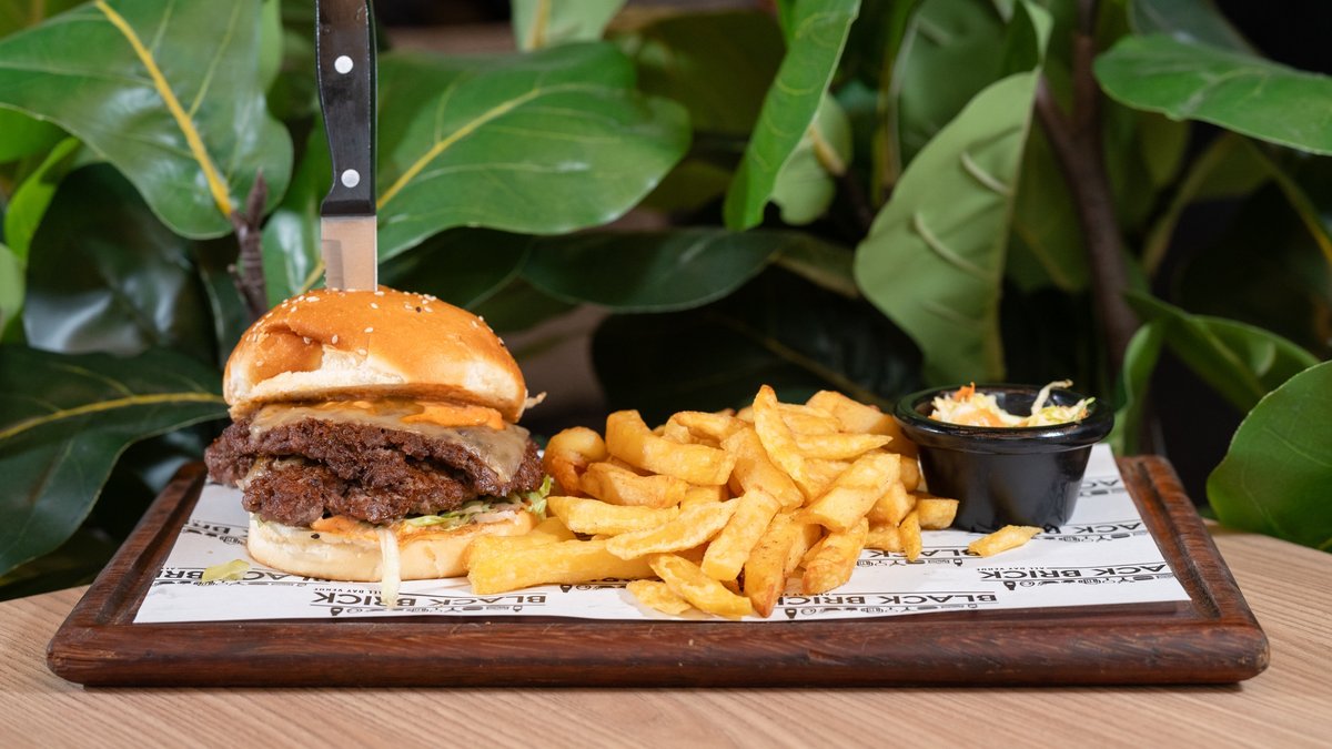• Brioche bun • Two beef patties • Iceberg • Caramelized onion • Cucumber pickles • Bacon jam • Tomato • Burger sauce • Fries • Coleslaw