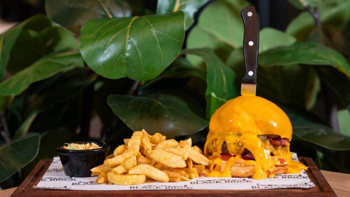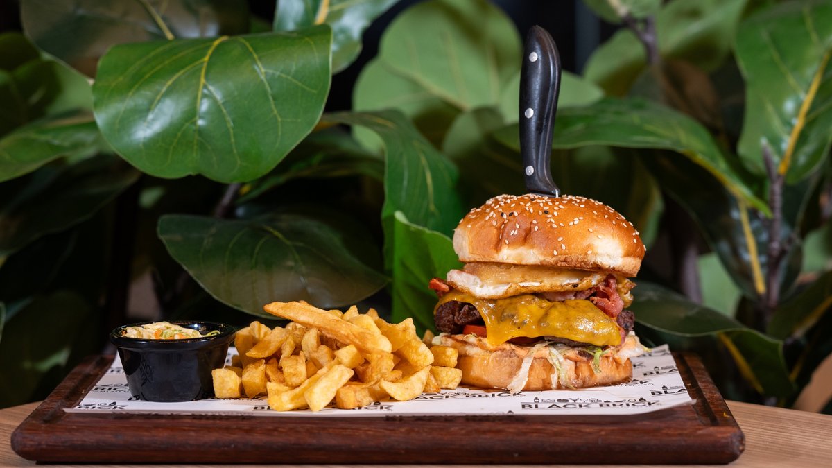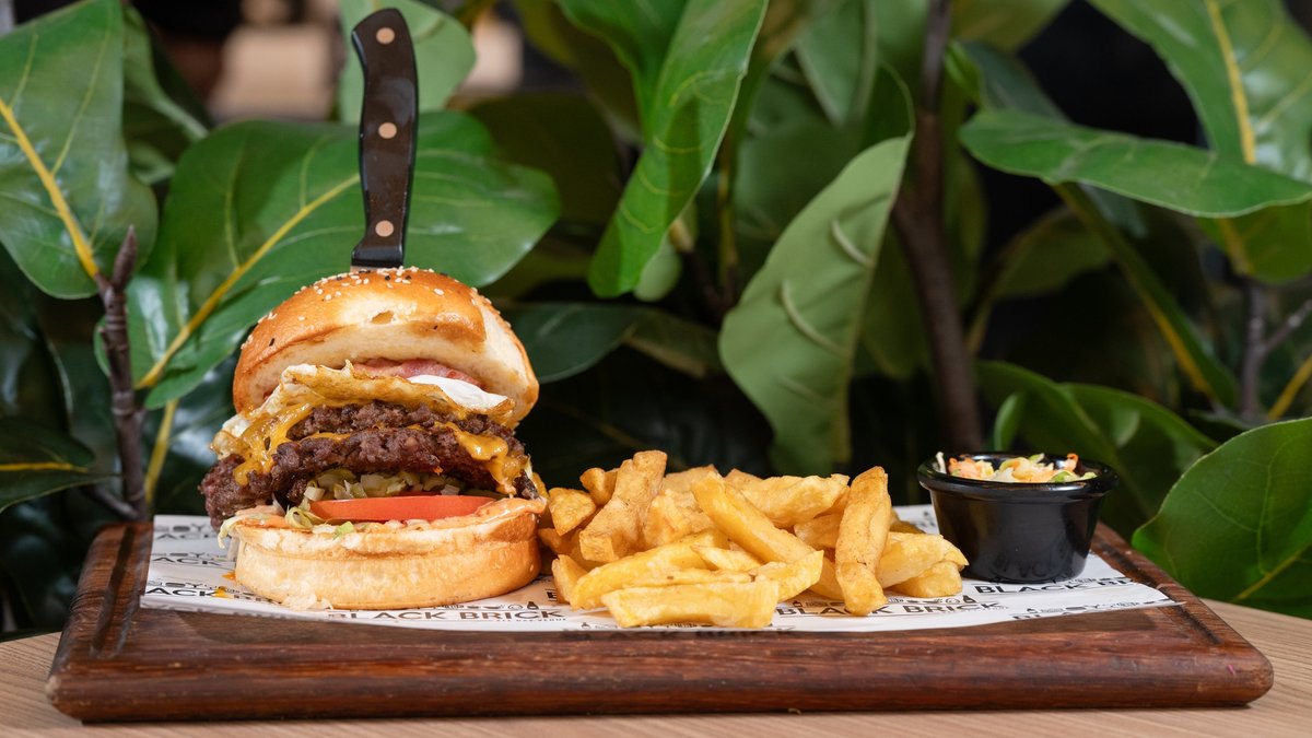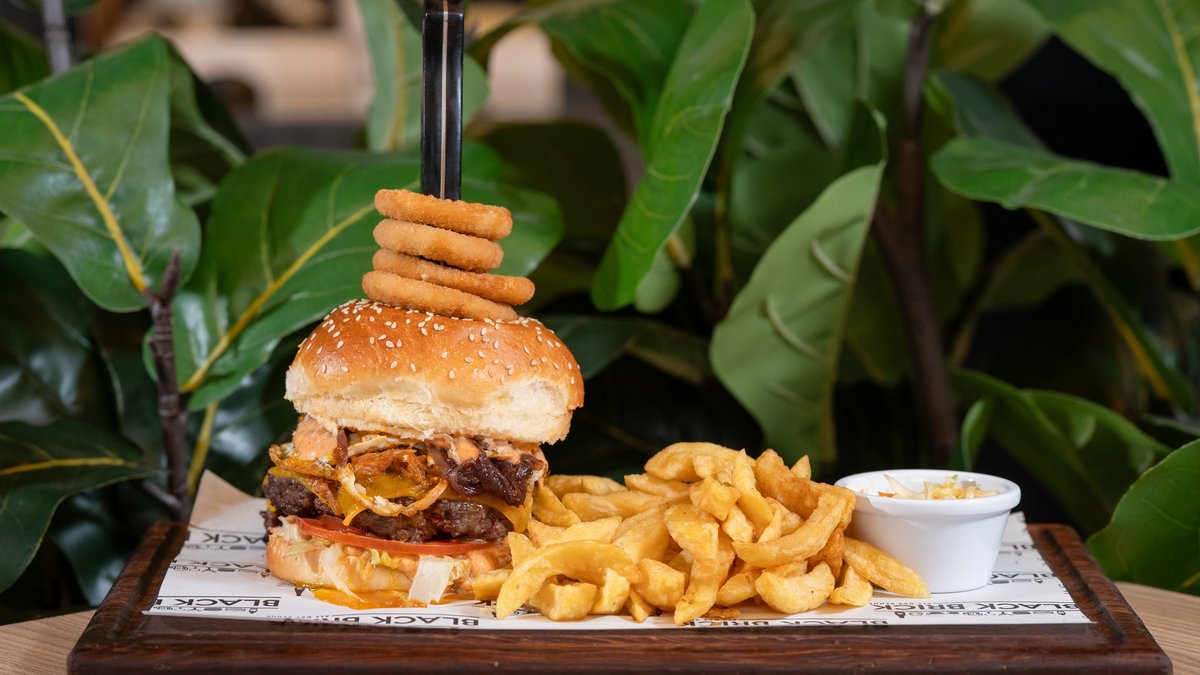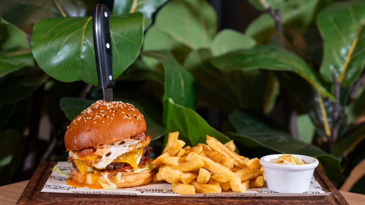 • Brioche bread • Sauce • Caramelized onion • Iceberg • Tomato • Beef patty • Cheddar slice • Fried bacon • Fried egg • Onion rings • Burger sauce • Fries • Coleslaw