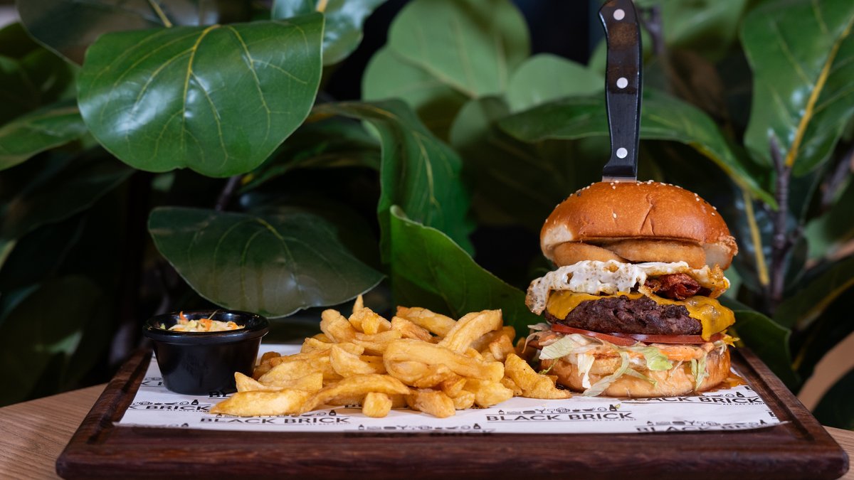 • Brioche bread • Beef patty • Burger sauce • Iceberg • Tomato slice • Cheddar slice • Fried egg • Fried bacon • Fries • Coleslaw