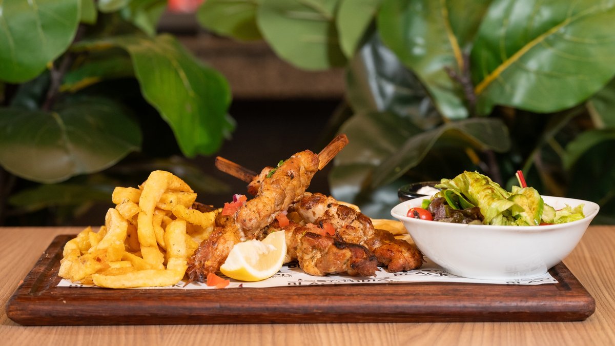 • Chicken Souvlaki • Tzatziki • Pita bread • Salad • Chopped tomato • Onion • Potato fries