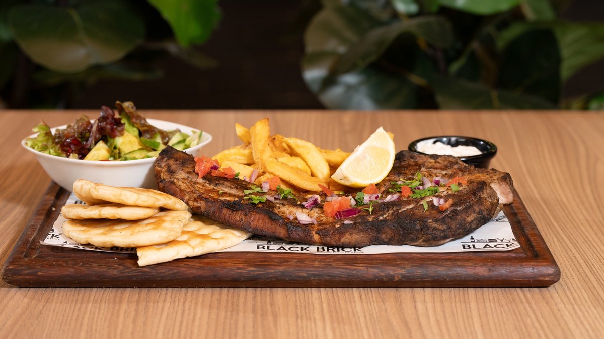 • Pita bread • Pork chop • Chopped tomato • Onion • Salad • Potato fries